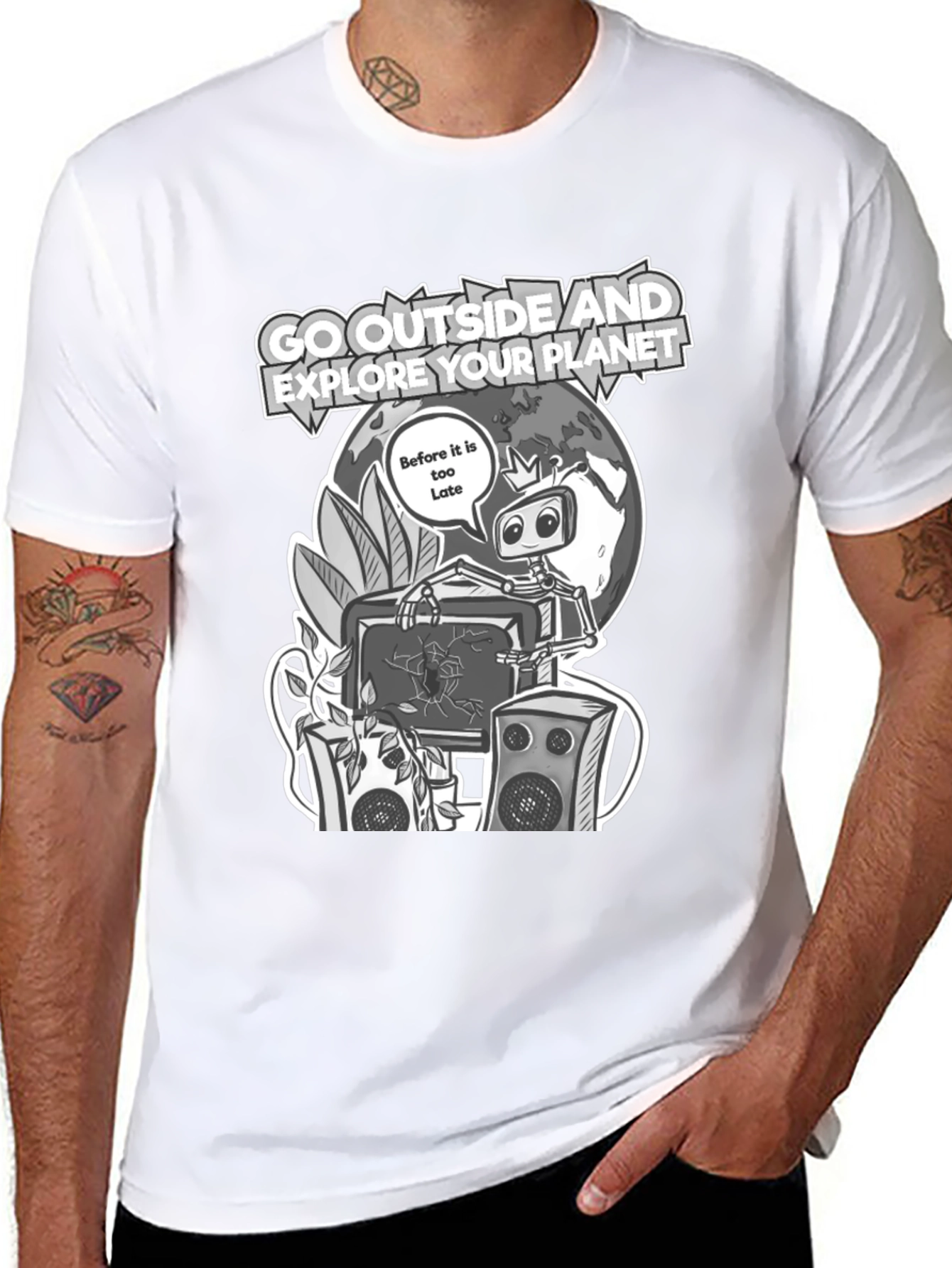 This black graphic tee features a unique, illustrative design promoting exploration and environmental awareness. The design includes a retro-style robot sitting in front of a broken television, with a speech bubble that says, "Before it is too Late", plants, speakers and a grayscale planet earth in the background. The text "GO OUTSIDE AND EXPLORE YOUR PLANET" is written in a stylized font above the design. The design promotes the importance of getting in touch with nature. This tee is a stylish way to make a statement about environmentalism. Made from a soft cotton blend, this tee is comfortable and durable. Perfect for everyday wear, outdoor adventures, or as a thoughtful gift.