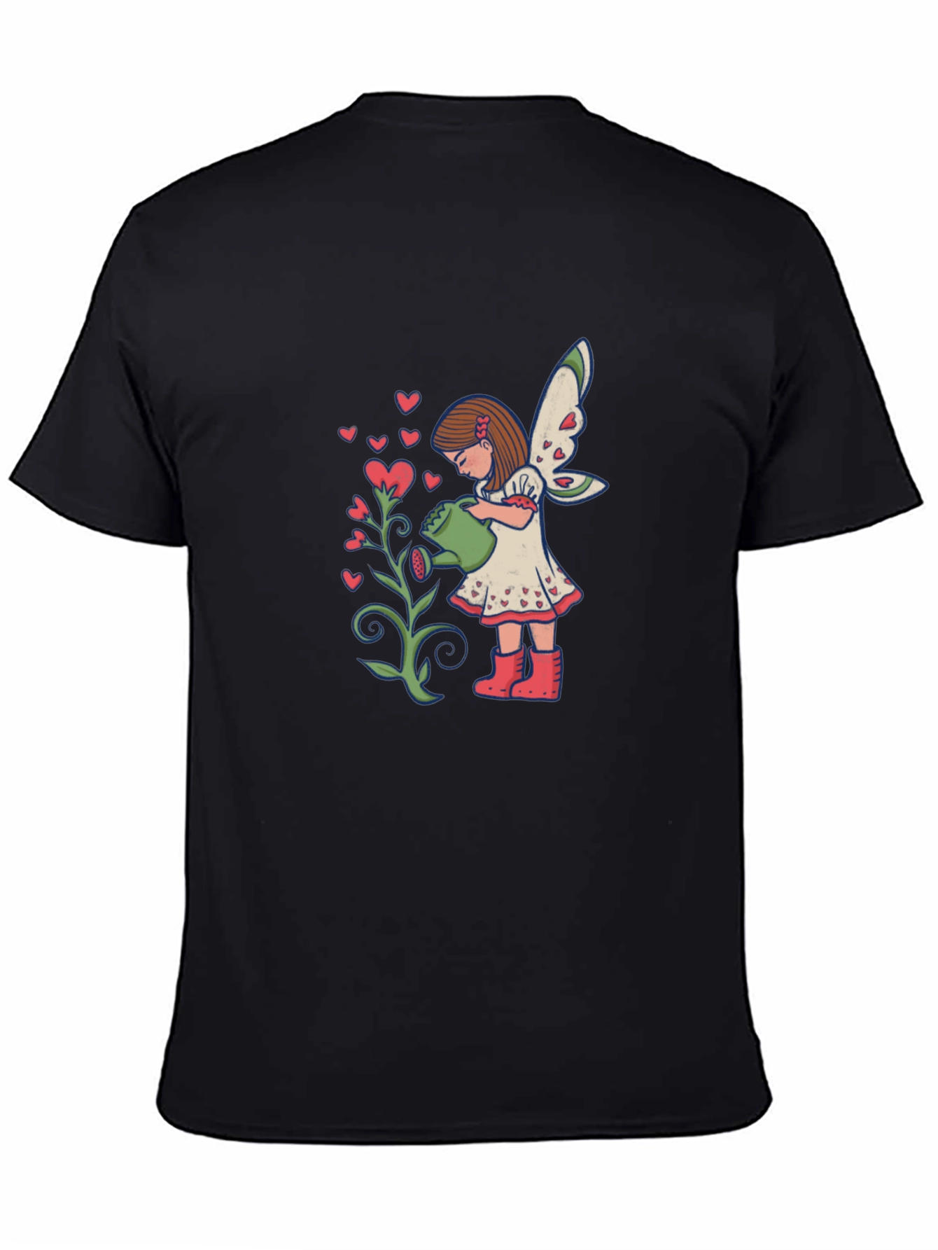 This eye-catching black t-shirt features a whimsical fairy graphic watering a plant that sprouts into hearts. The detailed illustration shows the fairy wearing a cute dress with heart accents and red boots, adding a touch of charm. Made from a soft and comfortable fabric, this tee is perfect for casual wear. Show off your playful side with this unique and stylish t-shirt. Ideal for those who love fairies, gardening, or simply want to add a touch of whimsy to their wardrobe. Stand out with this adorable and comfortable t-shirt!