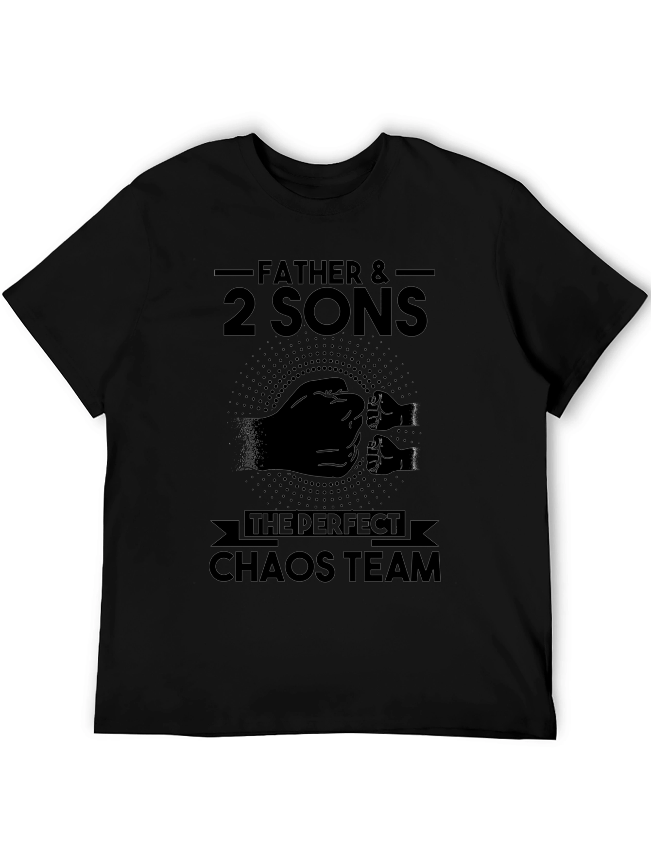 Showcase your bond with this stylish black T-shirt featuring the bold statement "Father & 2 Sons THE PERFECT CHAOS TEAM". This eye-catching design includes graphic clenched fists representing strength and unity. Made from comfortable, breathable fabric, this tee is perfect for casual wear, family outings, or as a fun gift. Embrace the chaos and celebrate your unique family dynamic with this standout T-shirt. Wear it with pride and let everyone know you're part of the perfect chaos team!