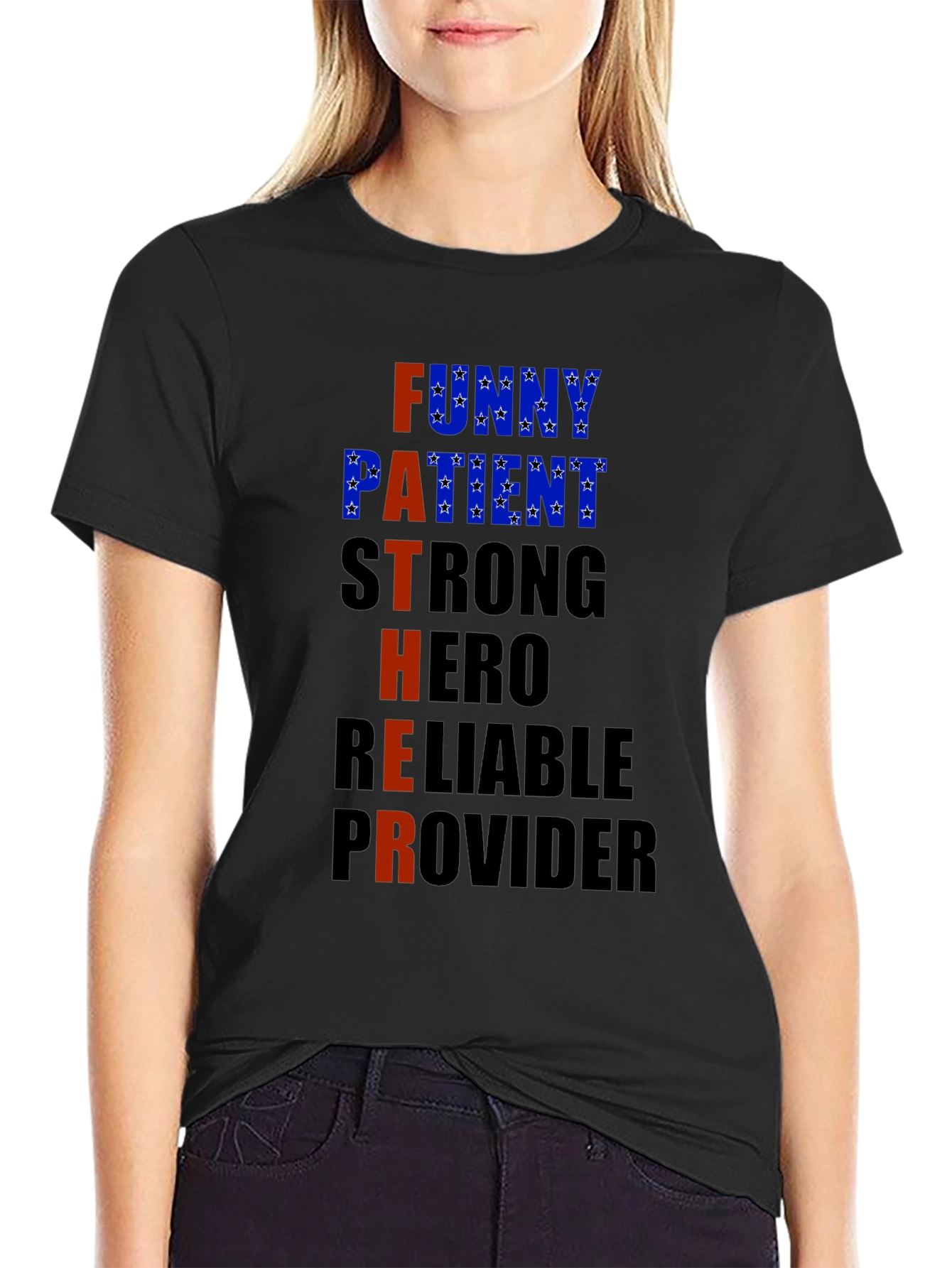 Show your appreciation with this stylish black T-shirt! Featuring the word 'FATHER' spelled out with descriptive words like 'Funny', 'Patient' (with a star pattern fill), 'Strong', 'Hero', 'Reliable', and 'Provider'. This comfortable T-shirt is perfect for casual wear, Father's Day celebrations, or as a thoughtful gift for the special dad in your life. Made from what appears to be a soft, breathable fabric, this T-shirt offers both comfort and style. Celebrate fatherhood with this unique and meaningful apparel!