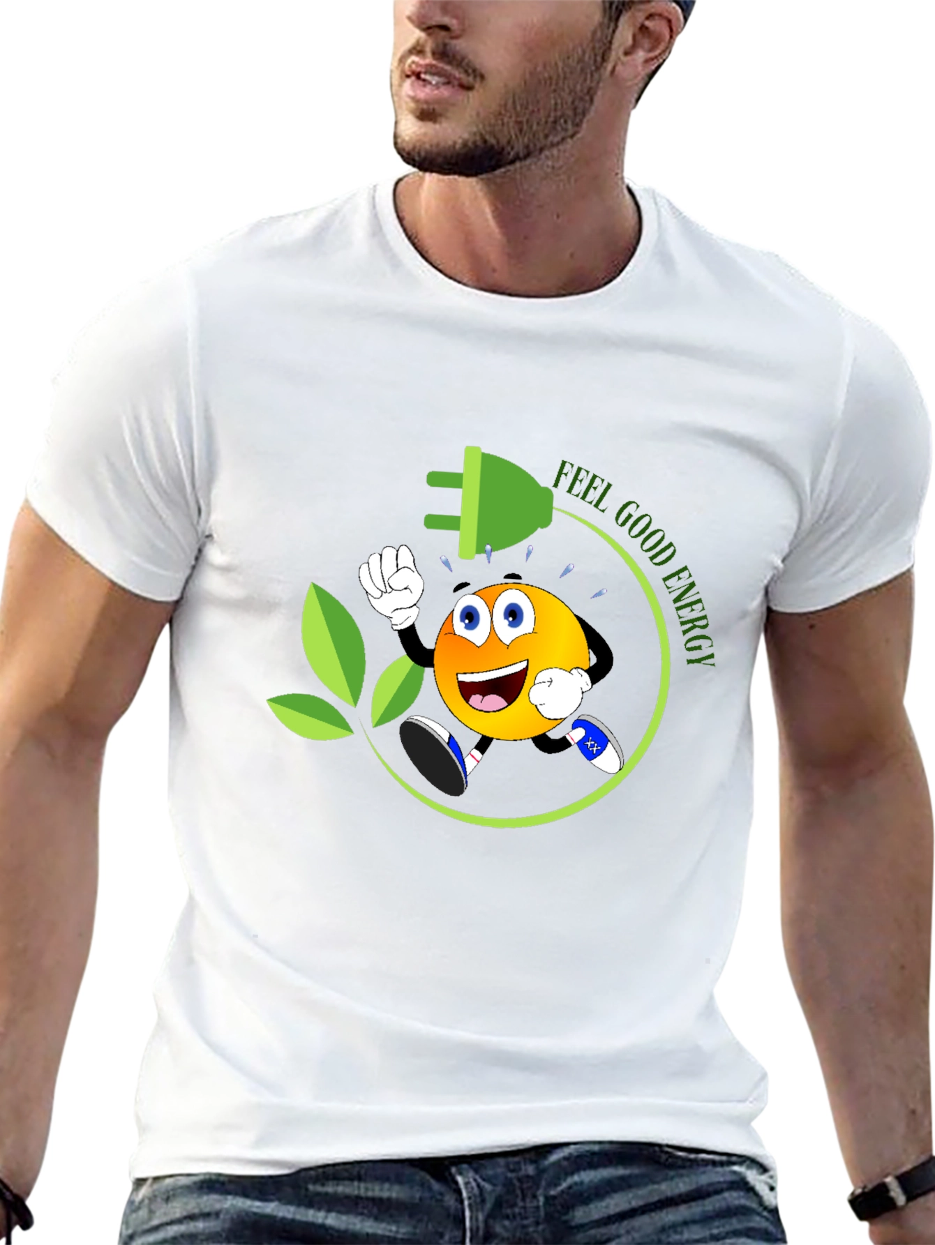 Show off your love for good vibes and renewable energy with this unique black t-shirt. The shirt features a playful cartoon design of a cheerful energy character. The design incorporates a green plug, leaves, and the phrase 'Feel Good Energy', promoting a positive and eco-friendly message. Made from comfortable material, this tee is perfect for everyday wear, casual outings, or spreading awareness about sustainable energy. Get yours today and make a statement!