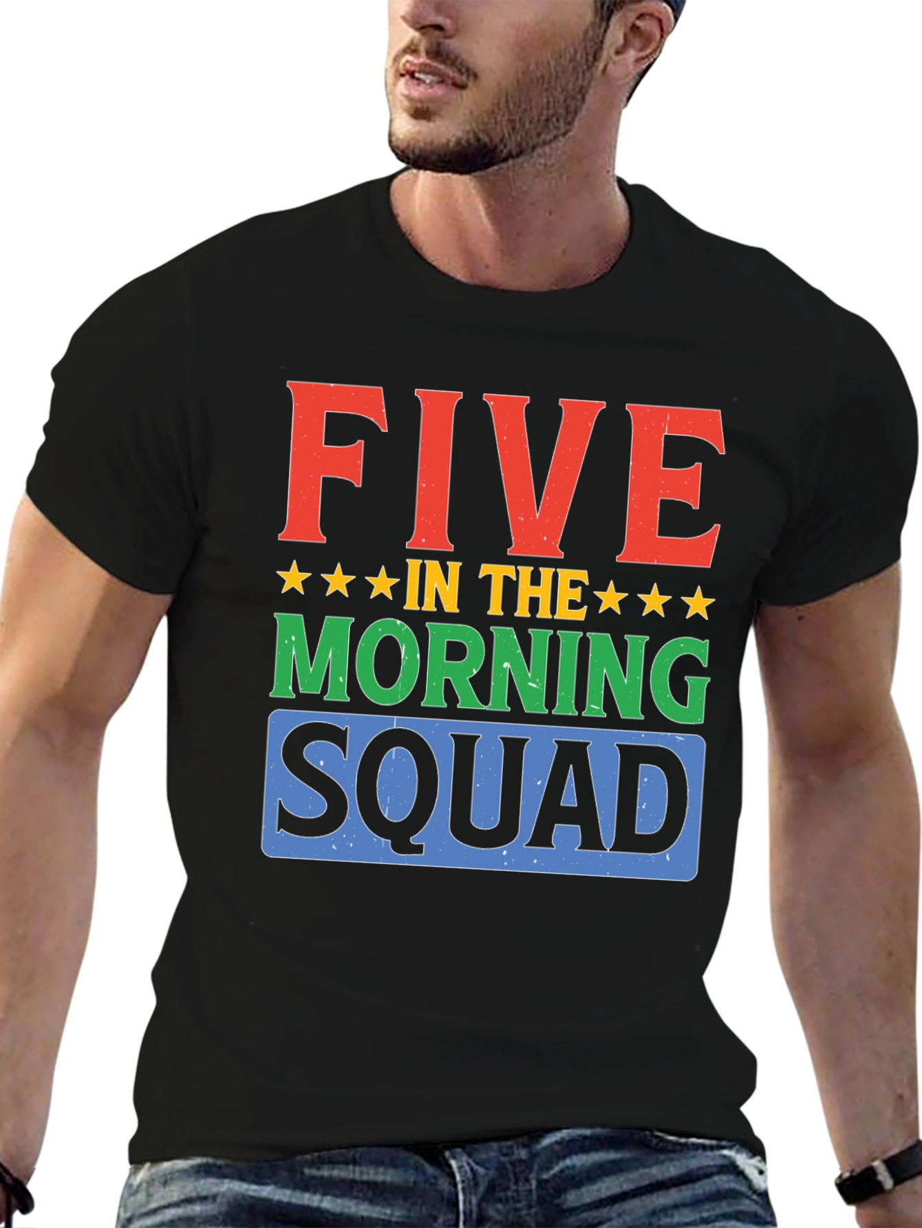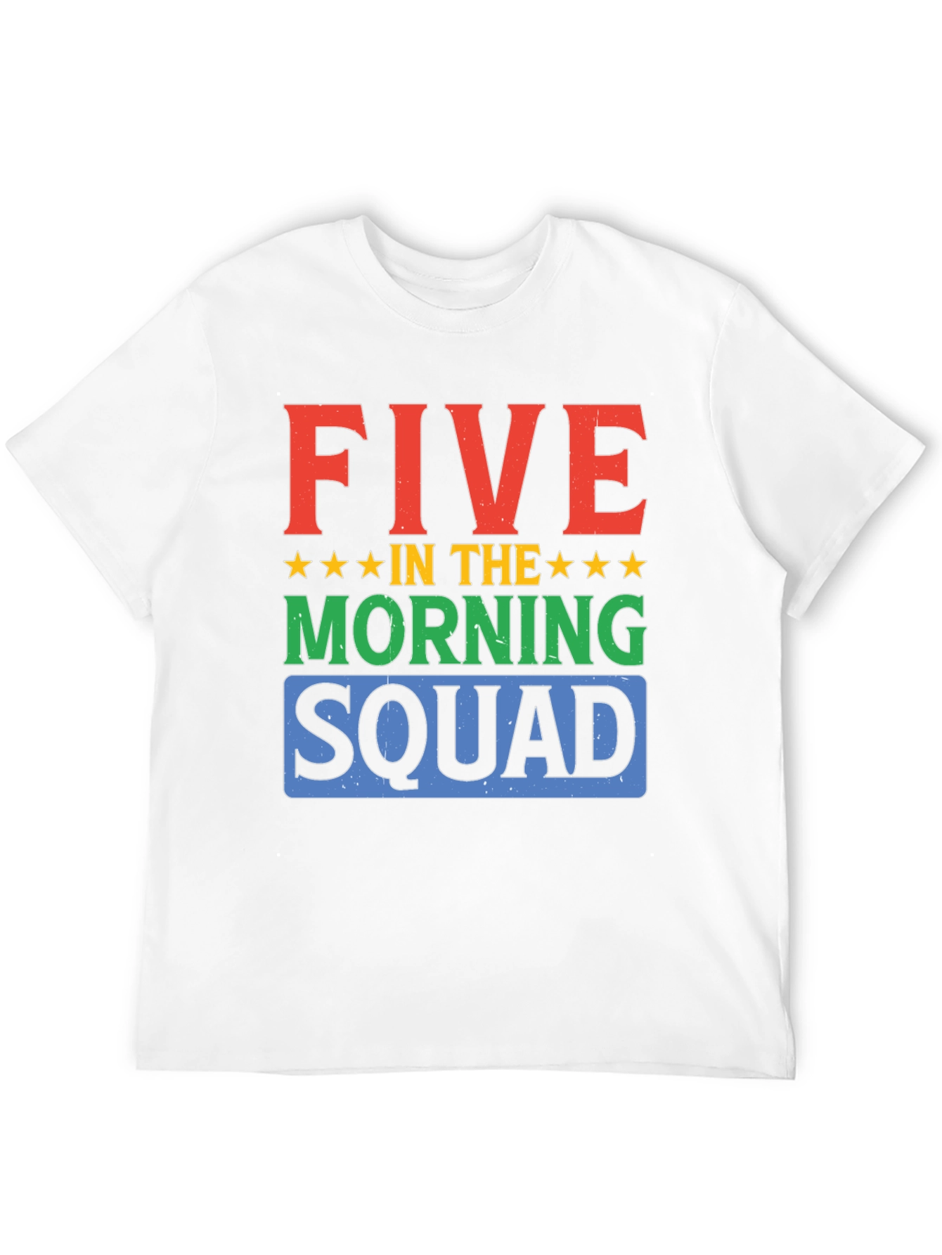Start your day with style in this bold graphic t-shirt. The shirt features the words "FIVE IN THE MORNING SQUAD" in a stacked design, with the word "FIVE" in red, "MORNING" in green, and "SQUAD" in blue, each color adding a vibrant pop. Gold stars separate the words. Made from a soft, breathable black fabric, this tee offers both comfort and durability. Perfect for early risers, fitness enthusiasts, or anyone who loves a motivational message. Wear it to the gym, during morning workouts, or as a casual everyday statement piece.
