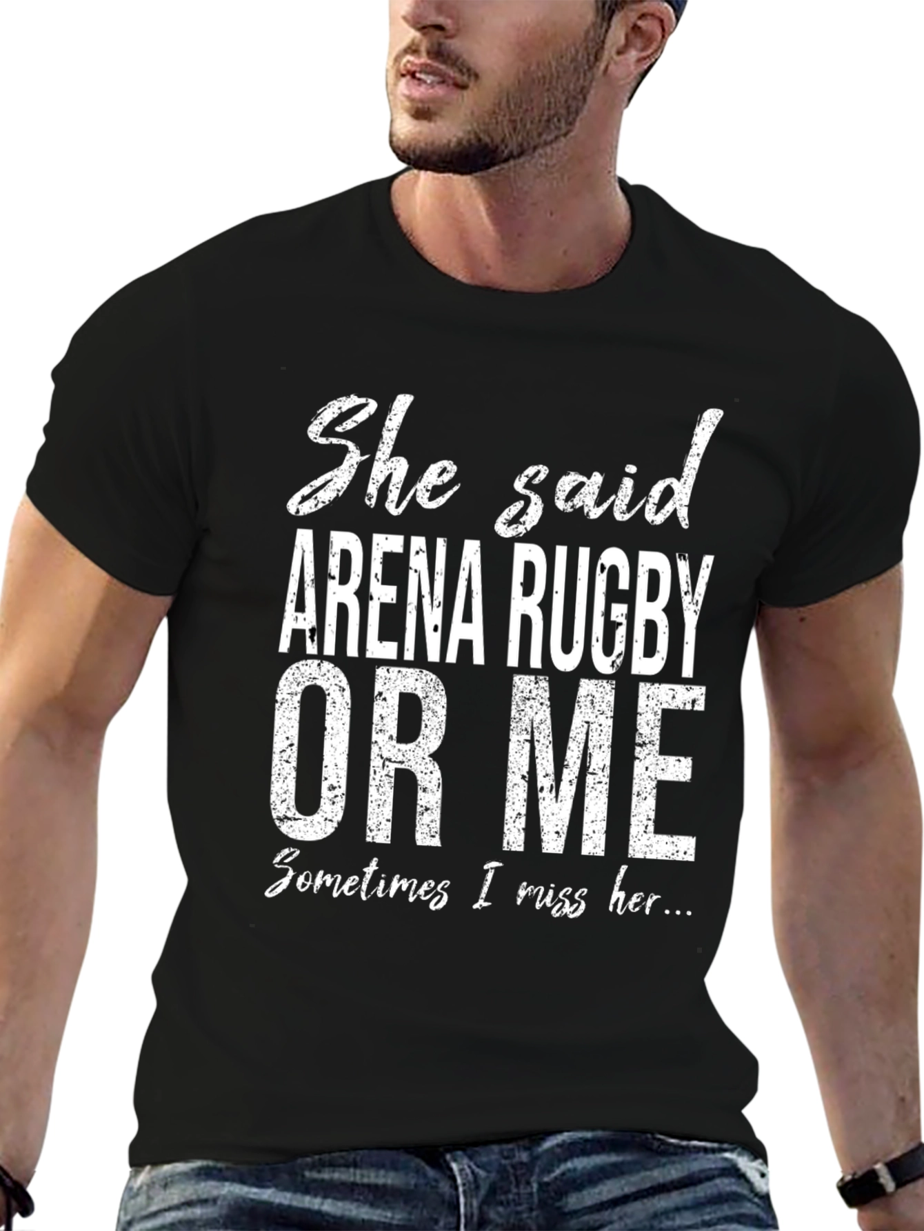 This black t-shirt features a humorous slogan that reads: "She said ARENA RUGBY OR ME. Sometimes I miss her..." The design is printed in white with a distressed, vintage aesthetic. The shirt is made of soft-looking fabric that looks comfortable. It appears to be a classic crew-neck style, ideal for casual wear. This tee is perfect for rugby fans with a sense of humor and makes a great conversation starter. Wear it to games, practices, or anywhere you want to show off your love for arena rugby and a good laugh. It is sure to be a hit with any rugby enthusiast!