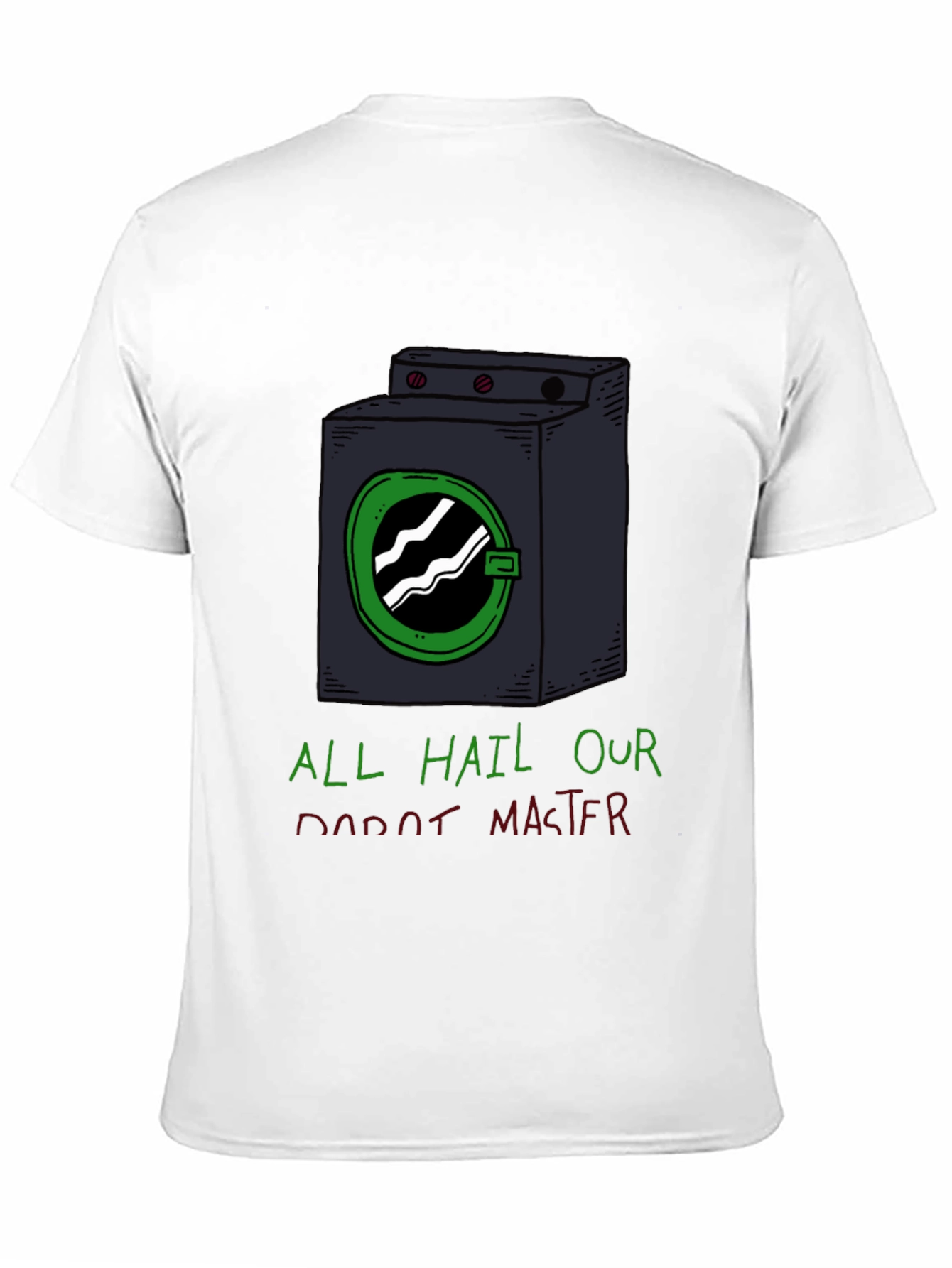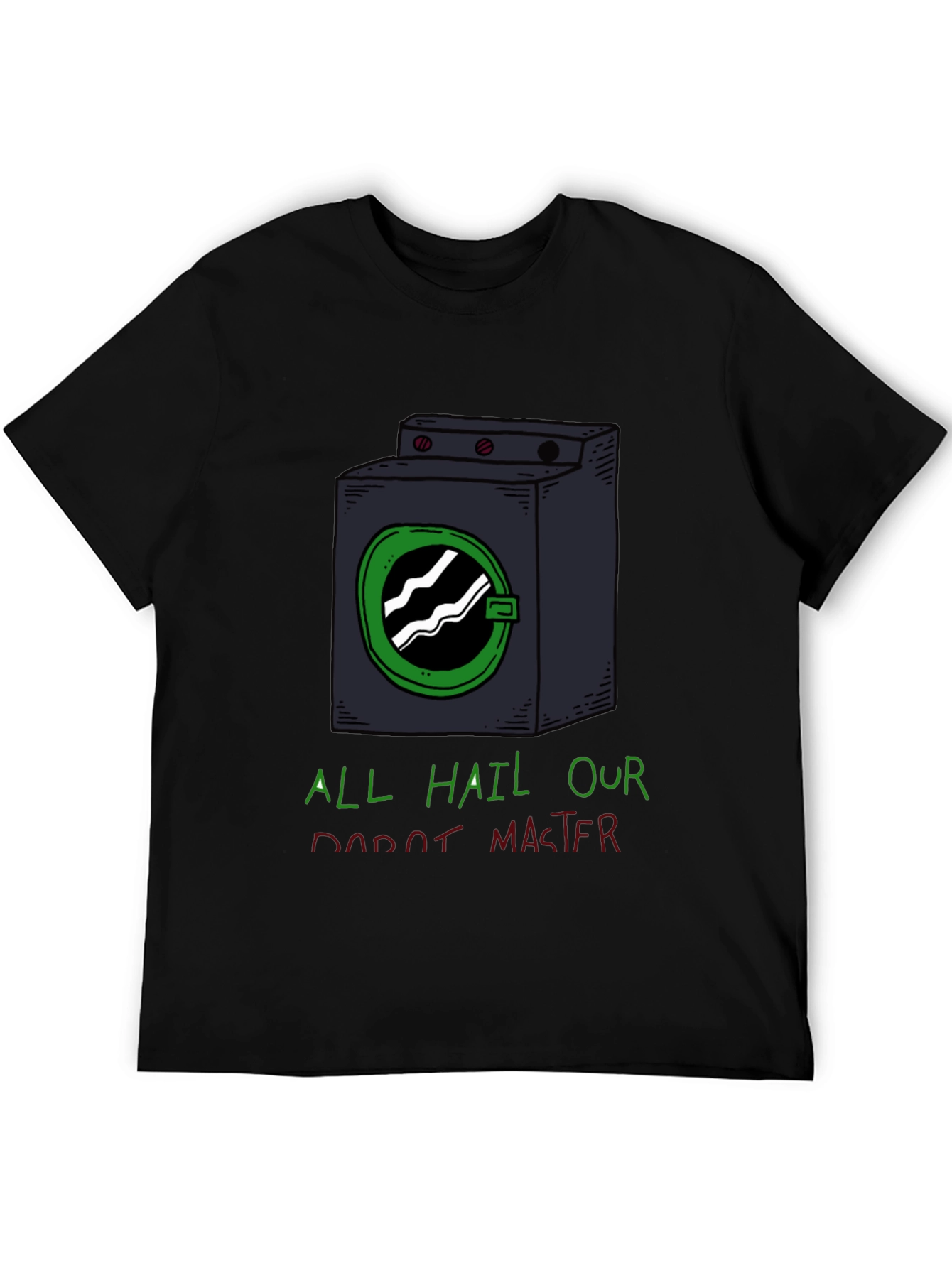 Show off your love for all things robotic with this eye-catching graphic tee! This black t-shirt features a unique, cartoon-style design of a washing machine robot. The humorous print reads "ALL HAIL OUR ROBOT MASTER" in green and red lettering. Made from a comfortable-looking fabric, this tee is perfect for casual wear and expressing your unique sense of humor. Ideal for everyday wear, conventions, or just lounging around the house, this t-shirt is sure to spark conversation and bring a smile to anyone's face. Get yours today and embrace the reign of the robot overlords!