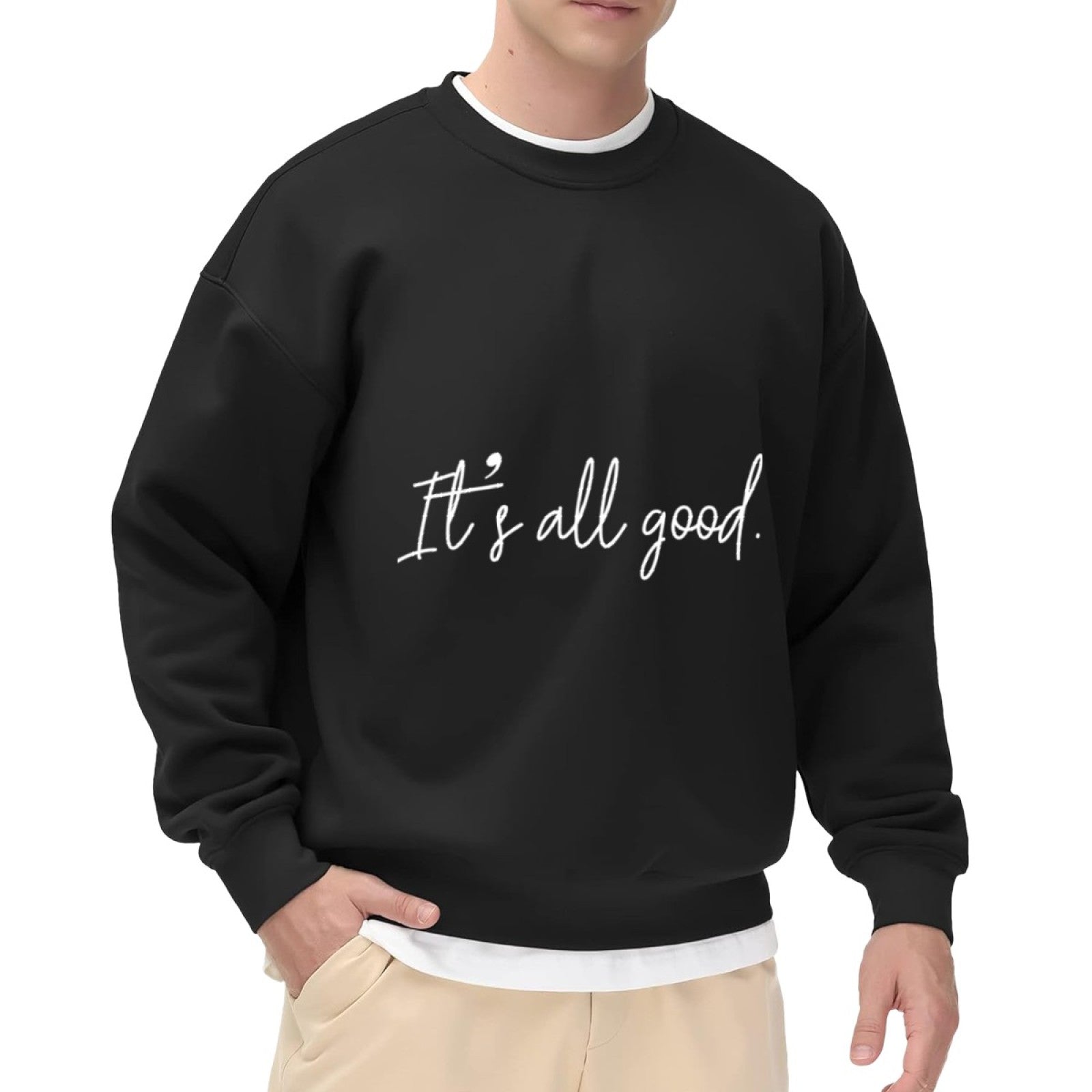 Spread optimism with this crewneck showcasing the uplifting 'It's all good.' slogan in a delicate white script. Ideal for those who appreciate subtle, meaningful fashion, this sweatshirt balances simplicity and style. Whether for lounging at home or running errands, it brings a calm, laid-back energy to any look.