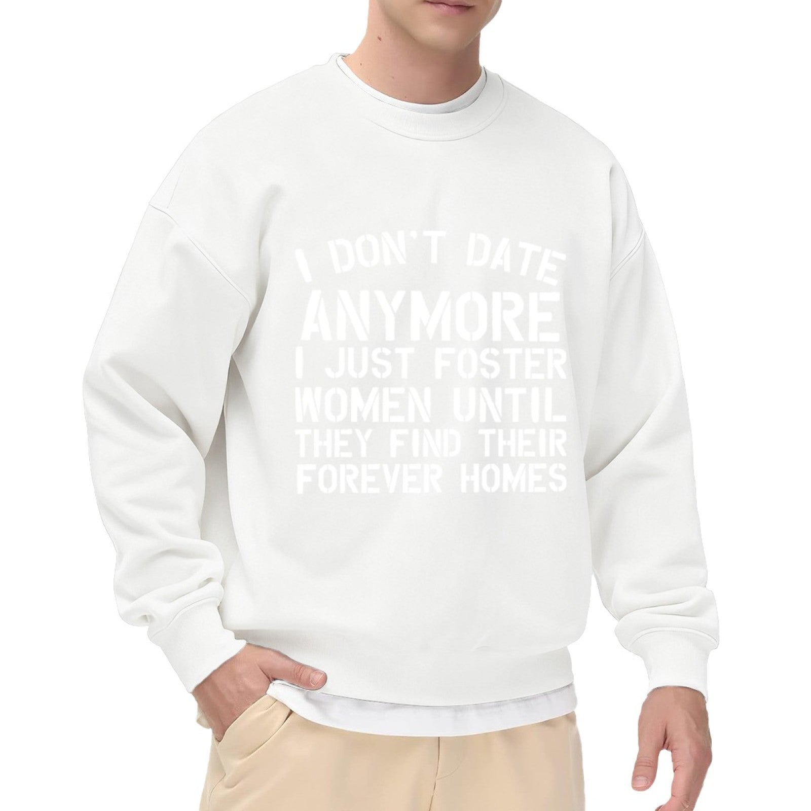 A bold crewneck featuring a sarcastic white text graphic that reads "I DON'T DATE ANYMORE I JUST FOSTER WOMEN UNTIL THEY FIND THEIR FOREVER HOMES". The all-caps design adds to the comedic punch, making it a conversation-starting piece for those with a dark sense of humor or a knack for witty one-liners. Soft cotton blend for everyday comfort.