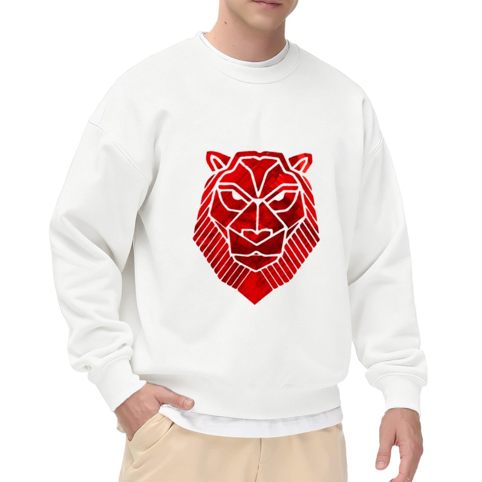 Make a bold statement with this crewneck showcasing a sleek red geometric lion head graphic. The stylized design uses clean lines and geometric shapes to create a contemporary interpretation of a lion's face, with piercing white eyes that add depth. Perfect for fashion-forward individuals or animal kingdom enthusiasts, this sweatshirt blends modern artistry with timeless wildlife symbolism. Relaxed fit pairs easily with jeans or joggers.