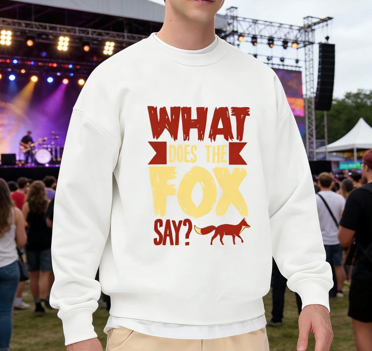Relive the viral meme this crewneck showcasing the iconic phrase "WHAT DOES THE FOX SAY?" in eye-catching red and yellow typography, paired with a cute red fox illustration. The retro design adds a humorous, lighthearted touch to any wardrobe. Made from a comfortable cotton blend, it's great for lounging, concerts, or hanging out with friends who appreciate a good throwback joke.