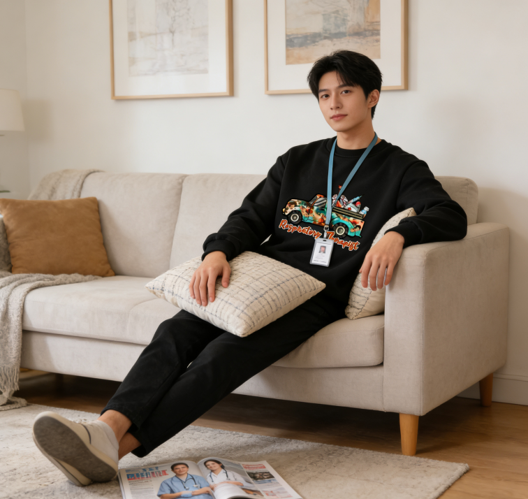 Honor respiratory therapists with this crewneck. The front displays a colorful watercolor truck filled with medical equipment (oxygen masks, breathing tubes, bandages) in teal and orange hues, paired with the elegant copper text "Respiratory Therapist". The design combines creativity and gratitude, ideal for gifting to a respiratory therapist or wearing to show appreciation for frontline healthcare workers. Relaxed fit pairs effortlessly with scrub pants, jeans, or leggings for a versatile, meaningful look.