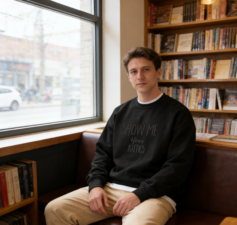 A crewneck with a subtle gray graphic that playfully declares "SHOW ME your KITTIES". The tonal design keeps it versatile, while the cheeky phrase adds personality. Made from a soft cotton blend, this sweatshirt is cozy enough for lounging and stylish enough for casual outings with friends. A must-have for cat lovers with a sense of humor.
