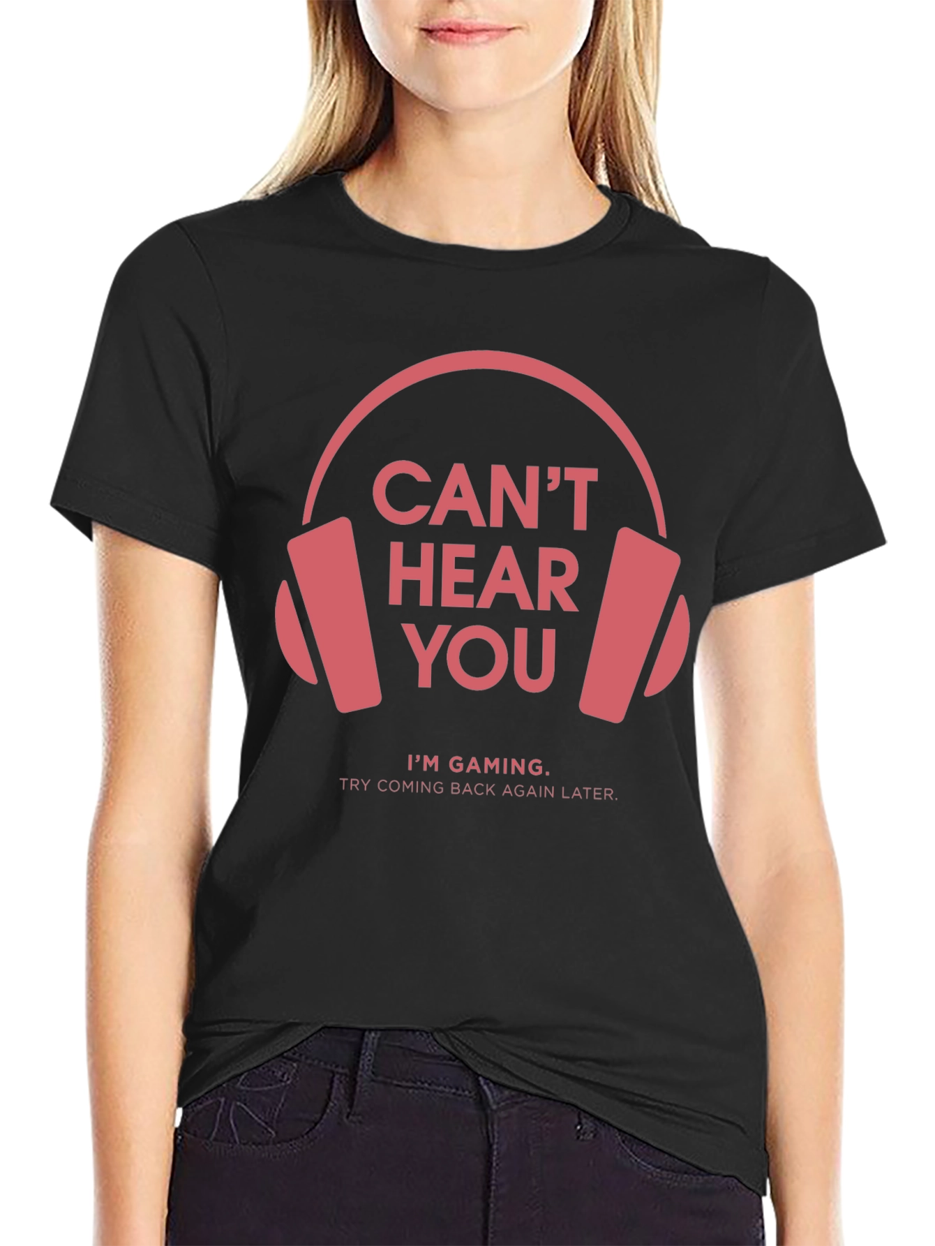 This black t-shirt is perfect for the dedicated gamer. The design features a graphic of headphones accompanied by the phrase "Can't Hear You" above and the text "I'm Gaming. Try coming back again later." below. The text and headphone graphic are printed in a pink tone, creating a bold contrast against the black fabric. This comfortable tee is ideal for long gaming sessions, esports events, or casual wear. Let the world know you're in the zone and not to be disturbed! Made from a comfortable, breathable fabric blend, this shirt is a stylish and humorous addition to any gamer's wardrobe. Get yours today and level up your style game!