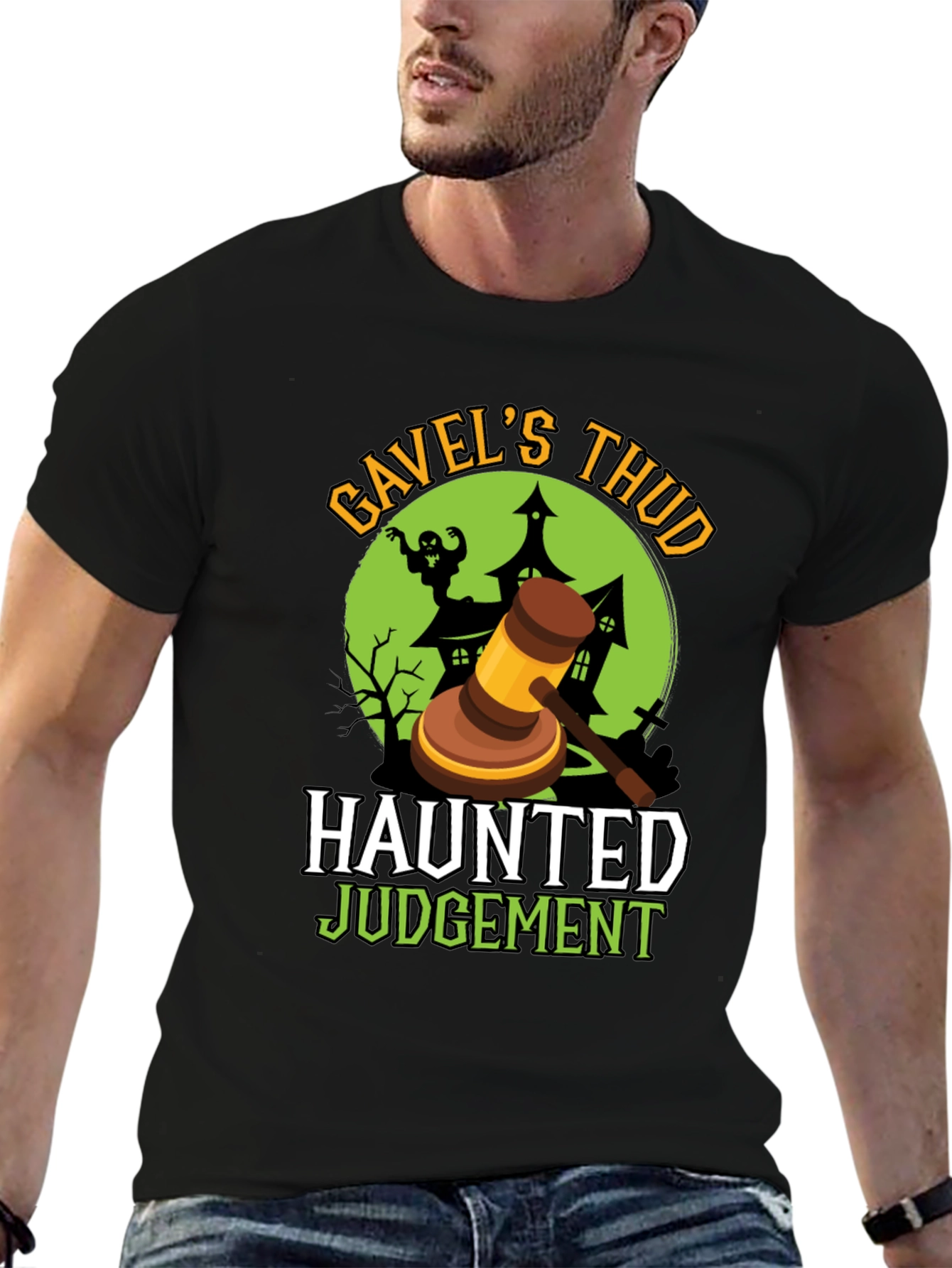 Get into the Halloween spirit with this unique t-shirt! The design features a spooky haunted house scene with a gavel, perfect for those who love a touch of legal humor with their Halloween scares. The shirt has "Gavel's Thud Haunted Judgement" printed, making it a clever conversation starter at any Halloween party or gathering. Made from comfortable, breathable fabric, this tee is ideal for casual wear or as part of a Halloween costume. Show off your fun and quirky side with this eye-catching t-shirt that blends the eerie with the everyday!