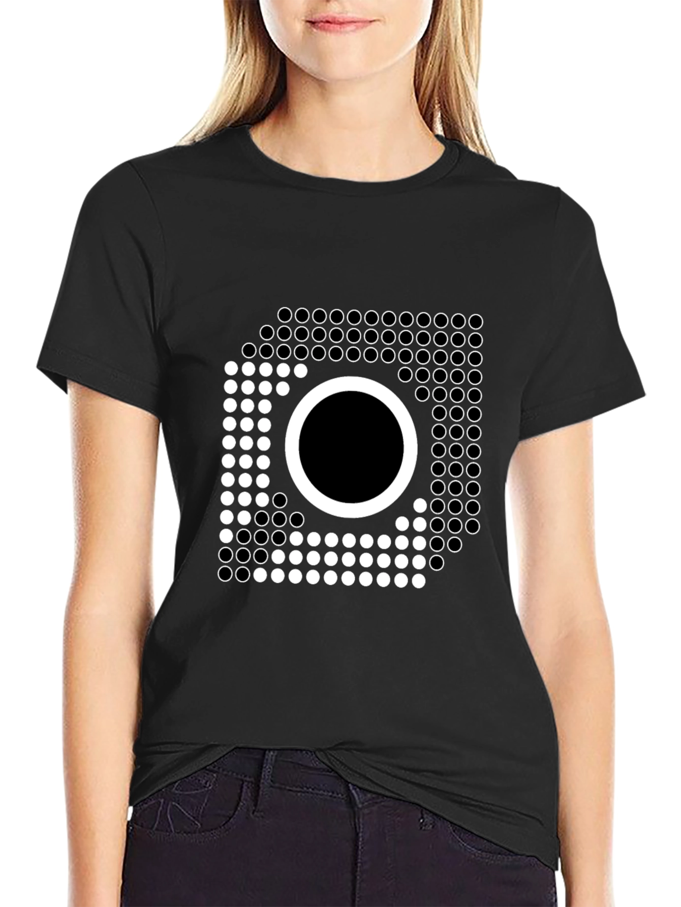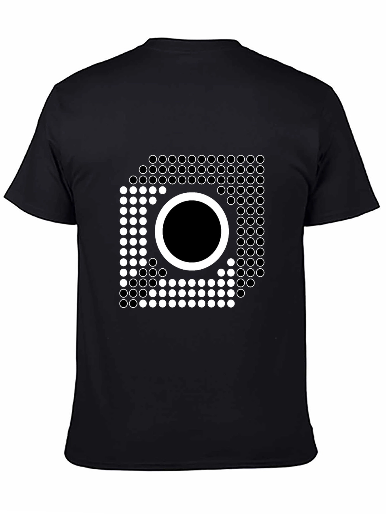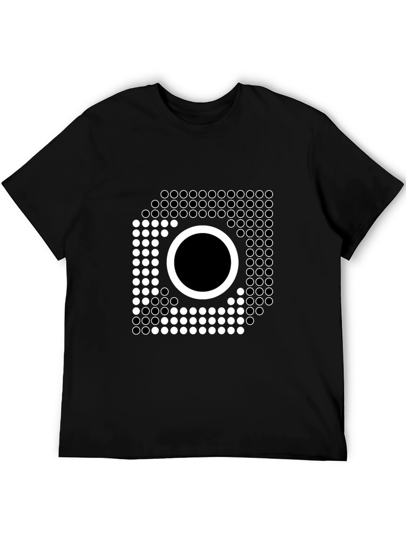 Elevate your wardrobe with this eye-catching black t-shirt featuring a unique geometric design. The graphic consists of precisely arranged white circles forming a square shape with a prominent filled-in circle in the center. Made from a soft, breathable fabric, this shirt offers both style and comfort. Perfect for casual outings, concerts, or expressing your unique sense of style. The minimalist yet bold design ensures this tee stands out, making it a versatile addition to any modern wardrobe. Pair it with jeans, shorts, or layer it under a jacket for a cool, effortless look.