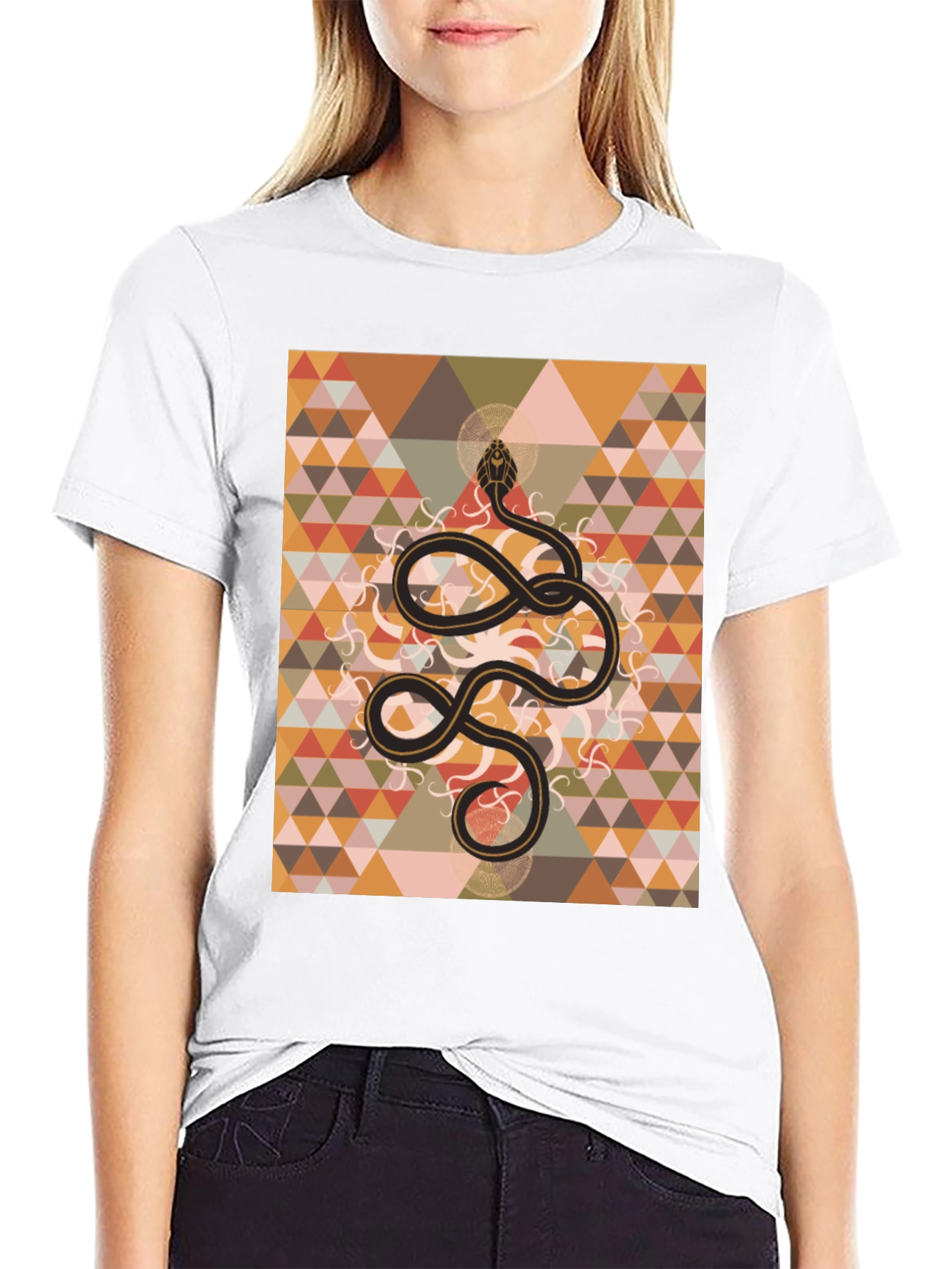 Embrace a bold style with this striking black T-shirt featuring a unique geometric snake print. The design showcases a stylized black snake winding across a backdrop of colorful triangles and intricate patterns. The vibrant color palette of the triangles creates an eye-catching contrast against the dark snake, making this tee a true statement piece. Perfect for casual outings, concerts, or expressing your individual flair, this shirt adds an artistic edge to any outfit. Made from comfortable, breathable fabric, it ensures a pleasant wear throughout the day. Stand out from the crowd and make a statement with this distinctive T-shirt.