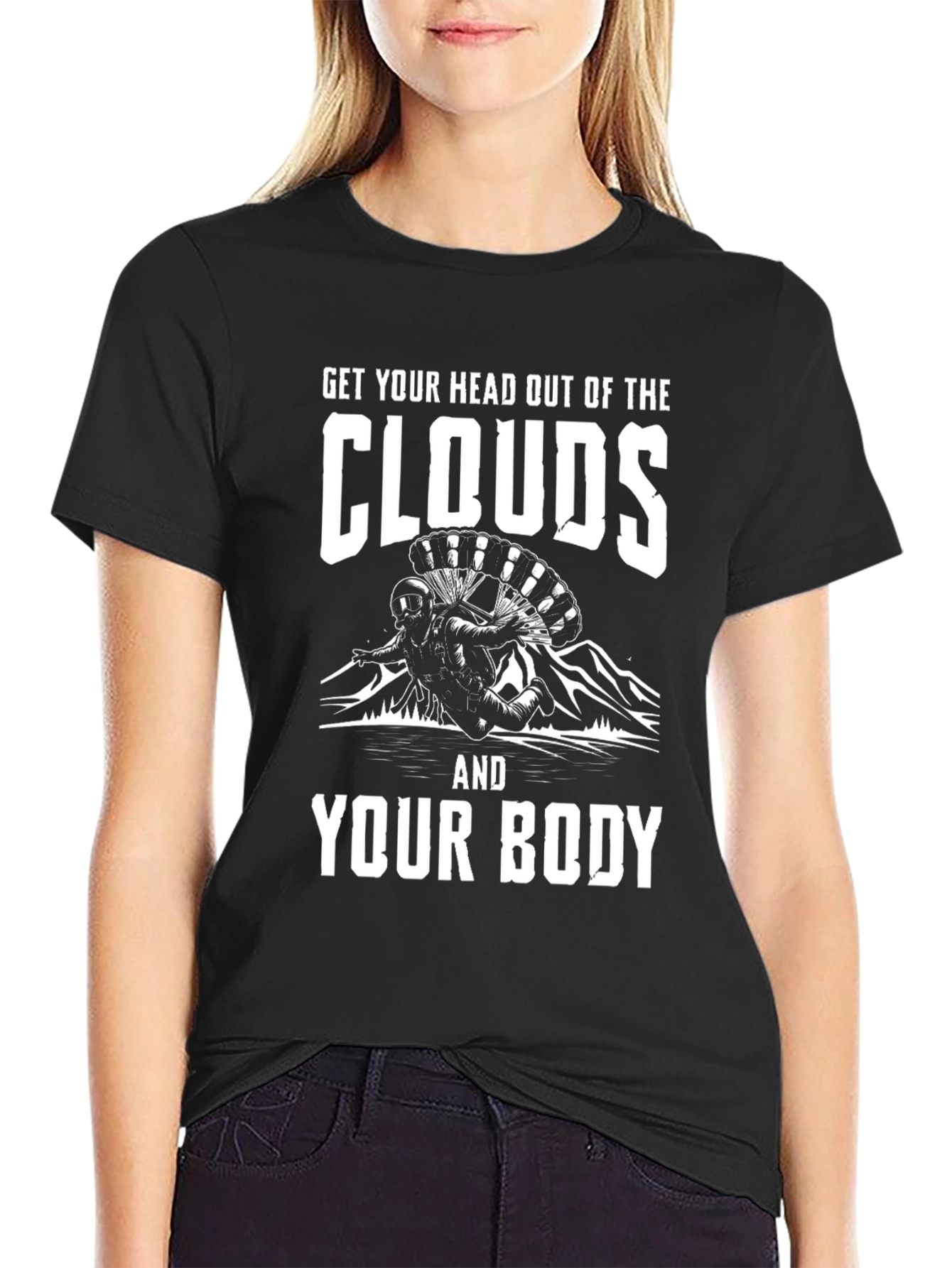 Elevate your style with this unique black t-shirt featuring a bold, eye-catching graphic. The design showcases the phrase "Get Your Head Out of The Clouds AND Your Body", printed in a crisp white font. In the middle, there is an image of a person paragliding over mountains. Made from comfortable fabric, this tee offers both style and comfort. Perfect for casual wear, outdoor activities, or as a conversation starter. Express yourself with this original t-shirt!