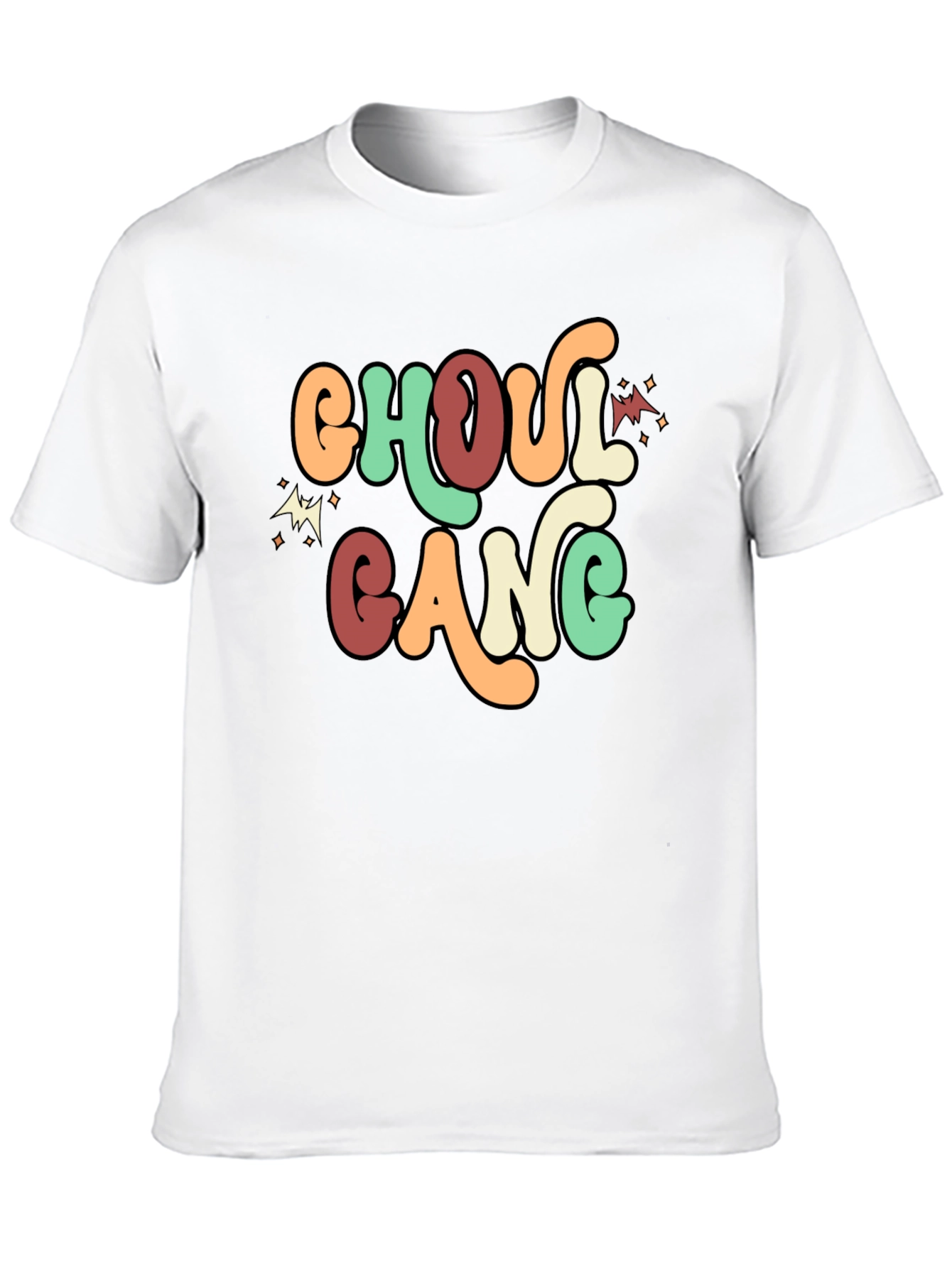 Embrace spooky season with this eye-catching "Ghoul Gang" t-shirt. The tee features a fun, retro-style font in a mix of orange, green, and brown, adding a vintage touch to your Halloween wardrobe. Made from a soft, comfortable fabric, this black t-shirt is perfect for casual wear, parties, or trick-or-treating. Its bold graphic makes a statement, while the classic fit ensures all-day comfort. Show off your Halloween spirit in style with this unique and playful t-shirt.