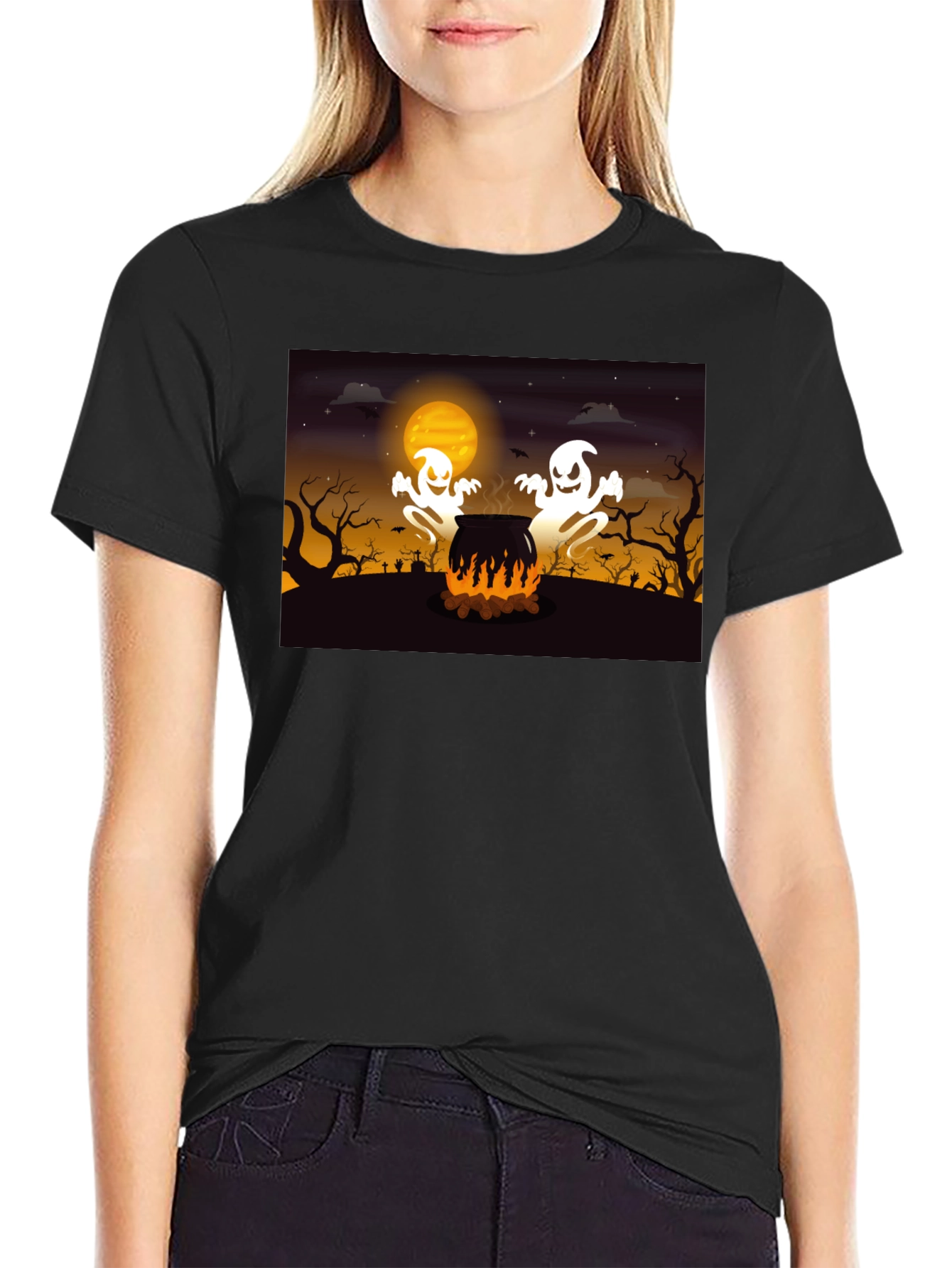 Embrace the spooky season with this unique black t-shirt. Featuring a vibrant Halloween-themed graphic, this tee showcases two playful ghosts hovering around a bubbling cauldron under a full moon. The design is set against a haunting landscape of bare trees and tombstones, adding to the eerie charm. Crafted from a comfortable, breathable fabric, this t-shirt is perfect for casual wear, Halloween parties, or simply expressing your love for the holiday. Stand out with this eye-catching design that captures the spirit of Halloween. A must-have addition to your seasonal wardrobe!