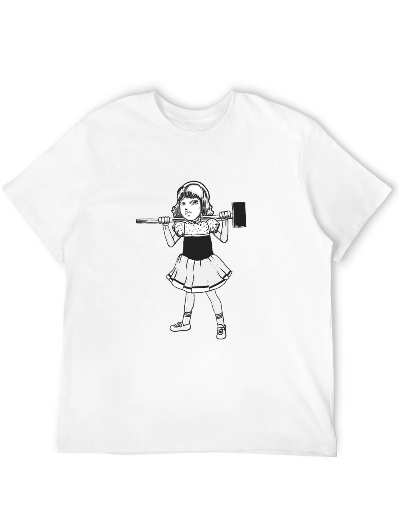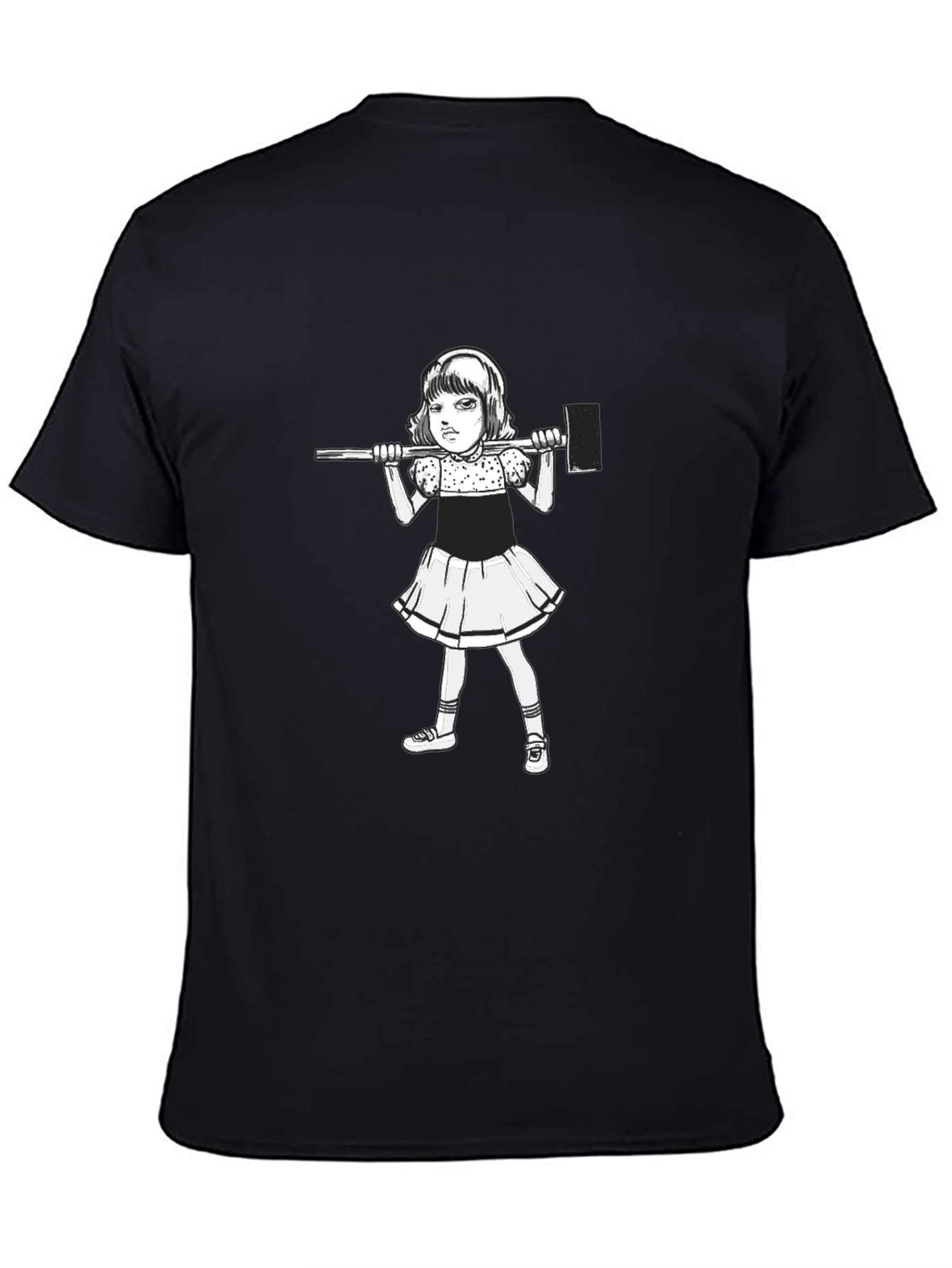 Showcase your unique style with this eye-catching black t-shirt. It features a striking graphic of a girl in a dress wielding a hammer, creating a bold and unconventional look. Made from a comfortable, breathable fabric, this tee is perfect for everyday wear. The design offers a unique statement, making it a great conversation starter. Wear it casually with jeans, shorts, or dress it up with a jacket. It's an ideal gift for those who appreciate distinctive, edgy fashion. Make a statement with this standout piece in your wardrobe!