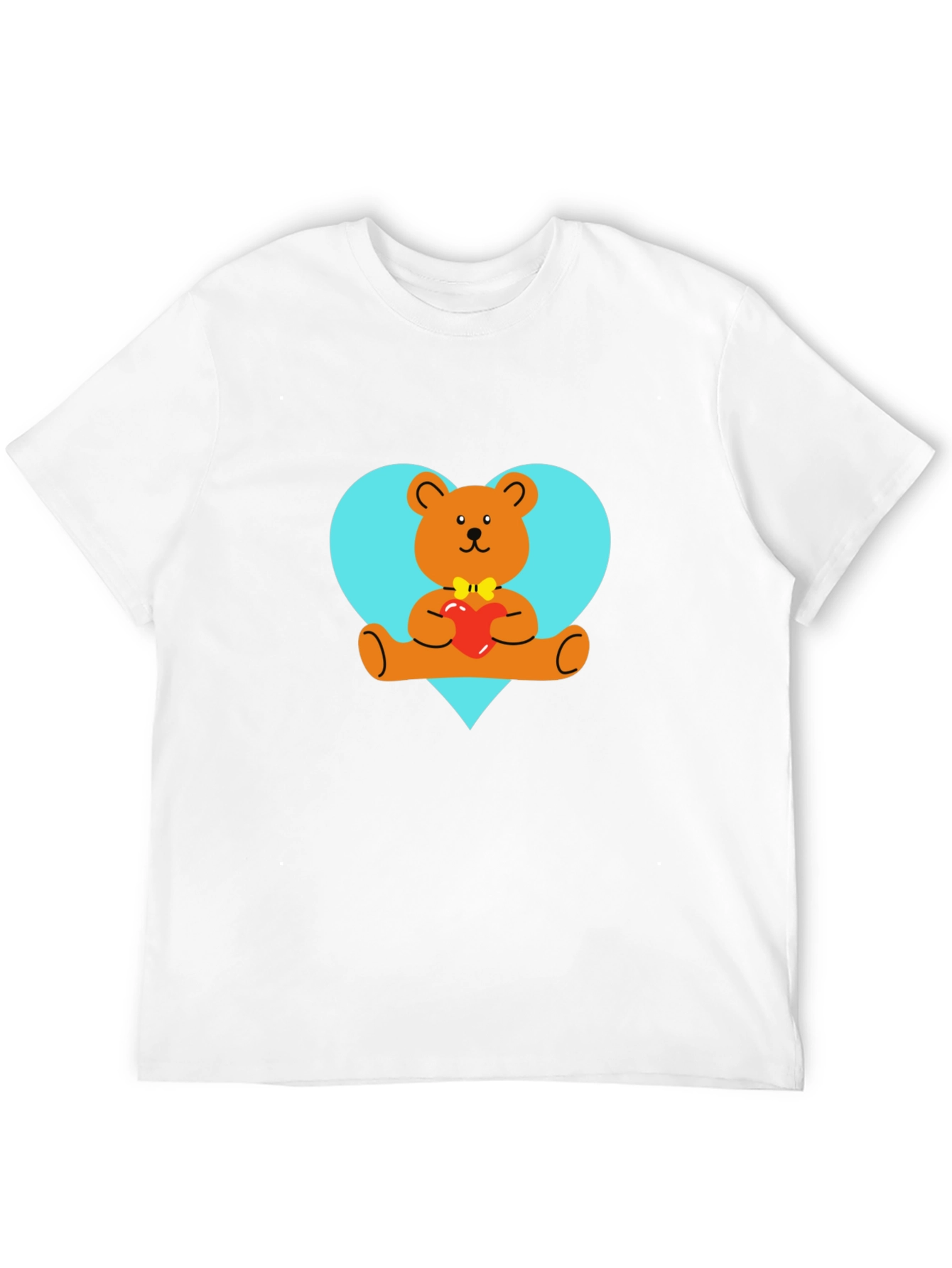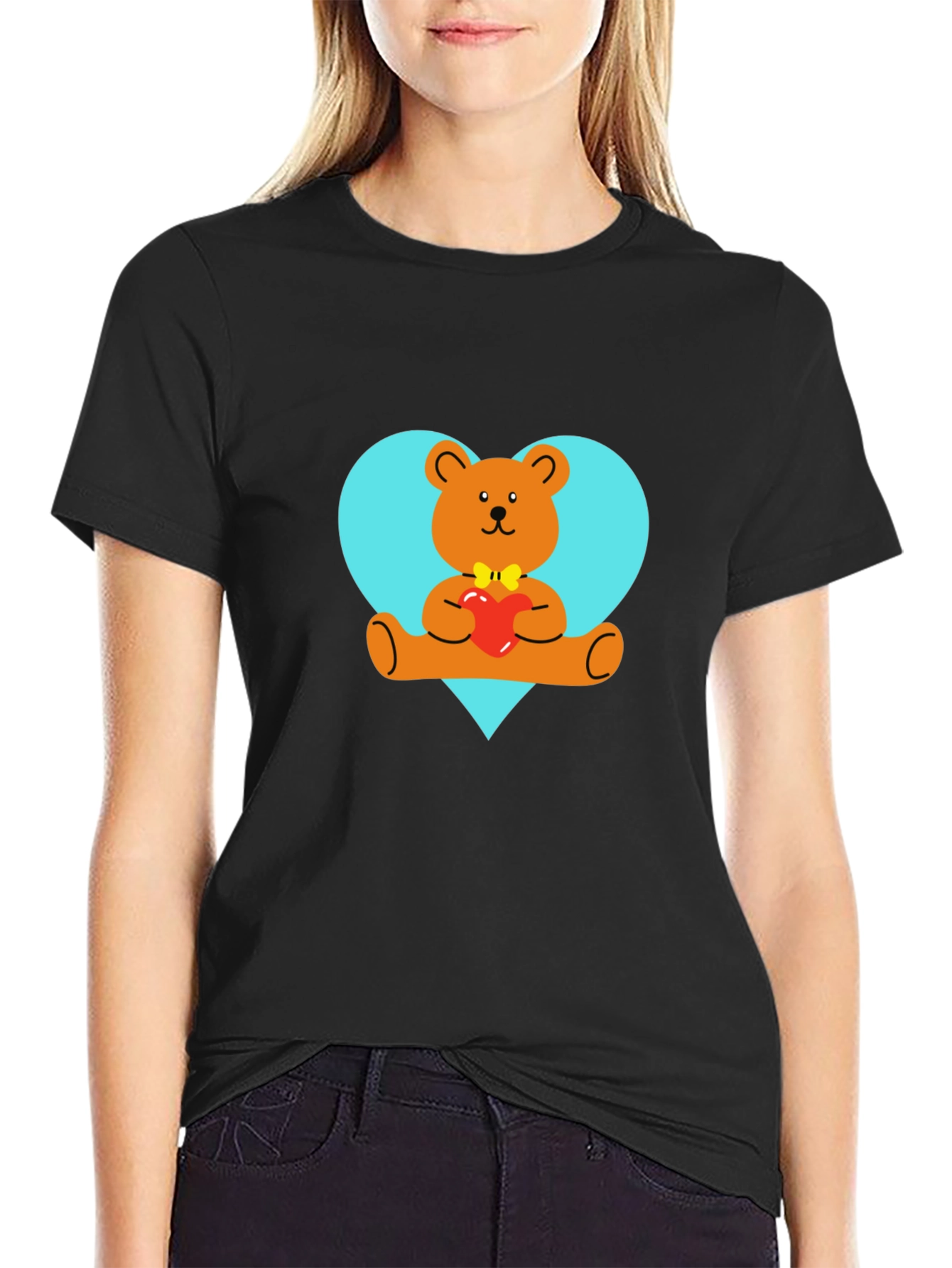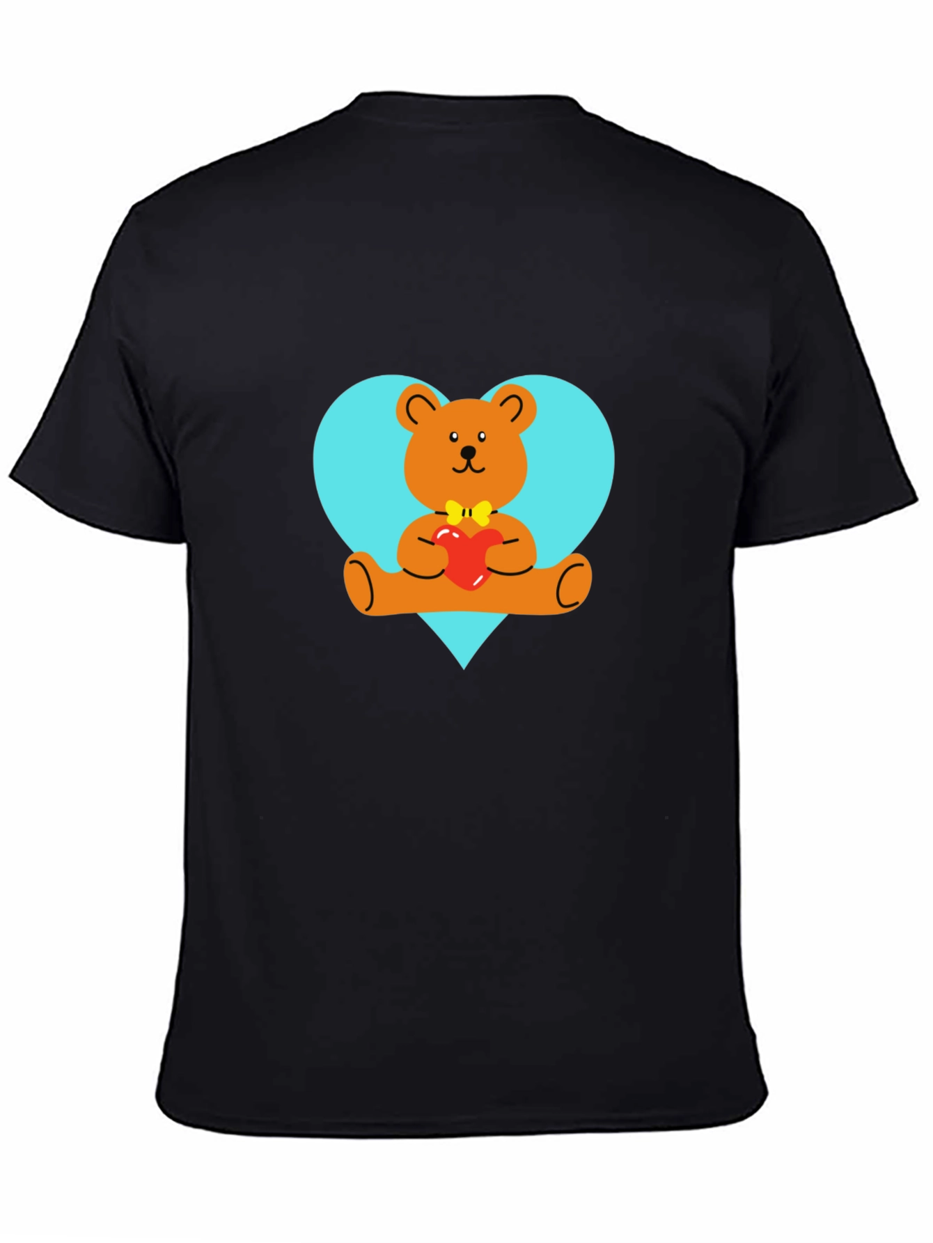Show your love with this adorable Heart Bear T-shirt. Made from a soft, breathable fabric, this classic black tee features a charming graphic of a teddy bear holding a heart set against a blue heart background. The design is vibrant and playful, making it a perfect casual wear option. Great for everyday style or a thoughtful gift. Dress it up with jeans or dress it down with your favorite casual pants! This tee brings a smile wherever you go.