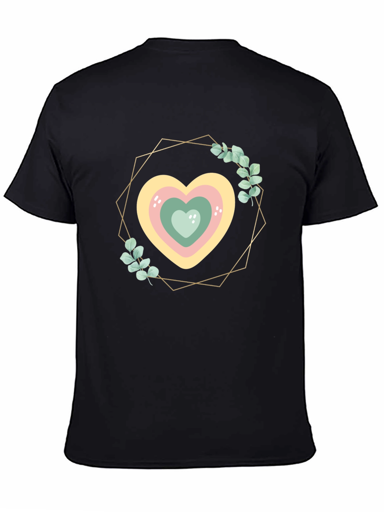 Embrace style and comfort with this eye-catching graphic tee. The design features a charming heart wreath, framed by a gold geometric shape and decorated with delicate leaves. The pastel-colored hearts create a soothing and aesthetically pleasing look. This black t-shirt is perfect for casual wear, adding a touch of whimsy to your everyday wardrobe. Made from a soft, breathable fabric, it offers a comfortable fit for all-day wear. Ideal for pairing with jeans, shorts, or skirts, this unique tee will elevate any outfit. Get ready to turn heads and showcase your unique fashion sense.