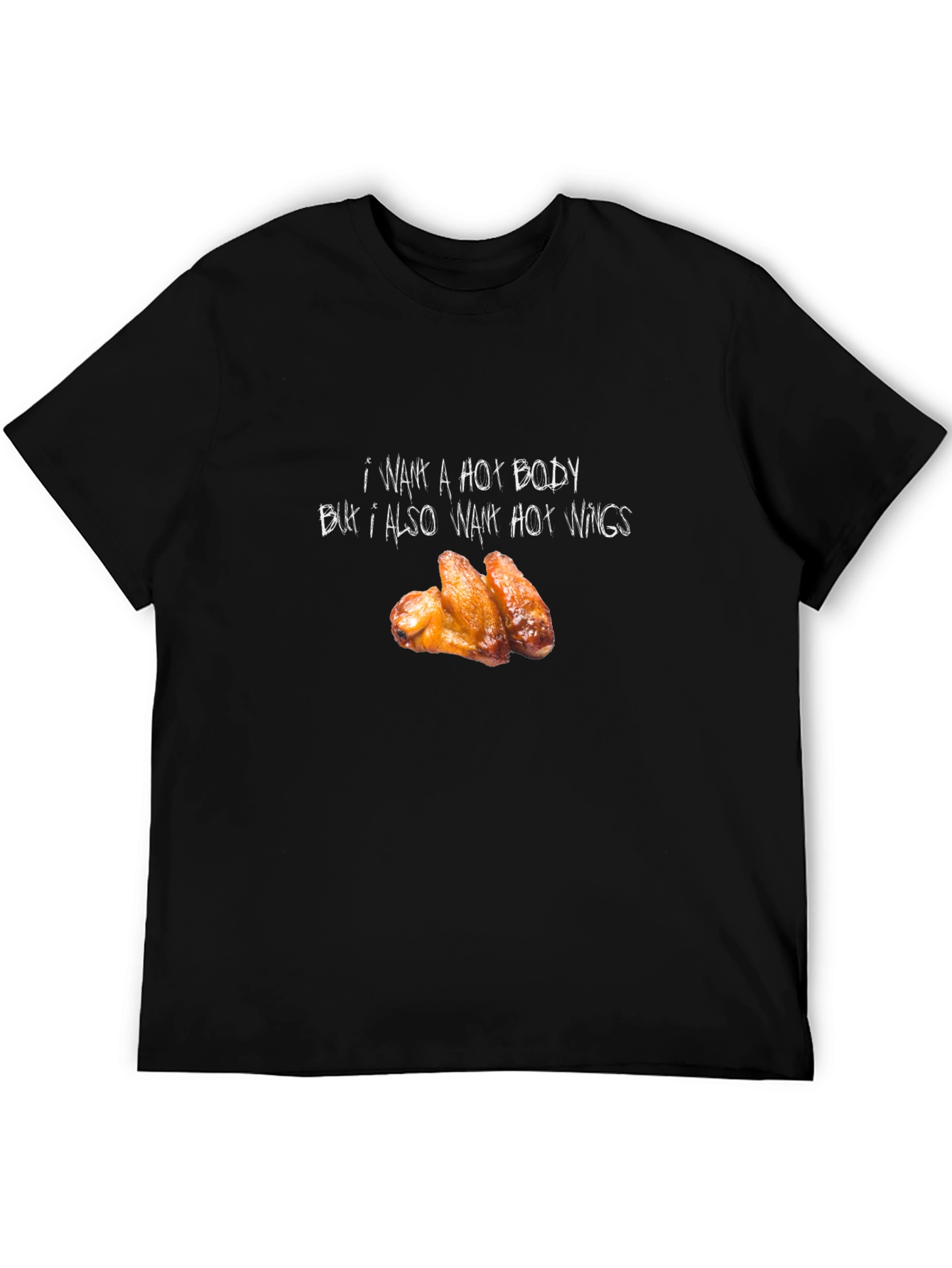 This black t-shirt features a humorous graphic print that combines fitness goals with a love for food. Emblazoned across the chest in a distressed white font is the phrase 'I WANT A HOT BODY BUT I ALSO WANT HOT WINGS', accompanied by a realistic image of three golden-brown, succulent hot wings. The shirt appears to be made from a soft, comfortable cotton blend, perfect for casual wear. This tee is a great conversation starter and expresses a fun-loving personality. Ideal for casual outings, weekend gatherings, or anyone with a good sense of humor and a weakness for delicious, spicy wings.