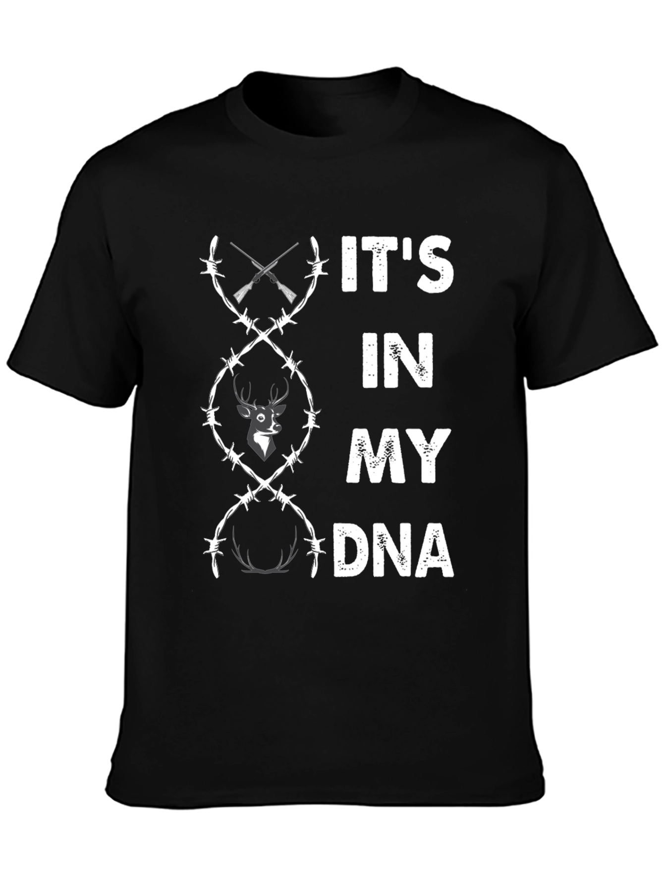Show off your passion for hunting with this unique black graphic t-shirt. The design features a stylized DNA strand made of barbed wire, with iconic hunting imagery of crossed rifles and a deer head. The bold white text proclaims "IT'S IN MY DNA", perfect for the avid hunter. Made from what appears to be comfortable cotton fabric, this short-sleeved tee is ideal for casual wear, hunting trips, or as a gift for the outdoorsman in your life. Make a statement and wear your hunting spirit on your sleeve!