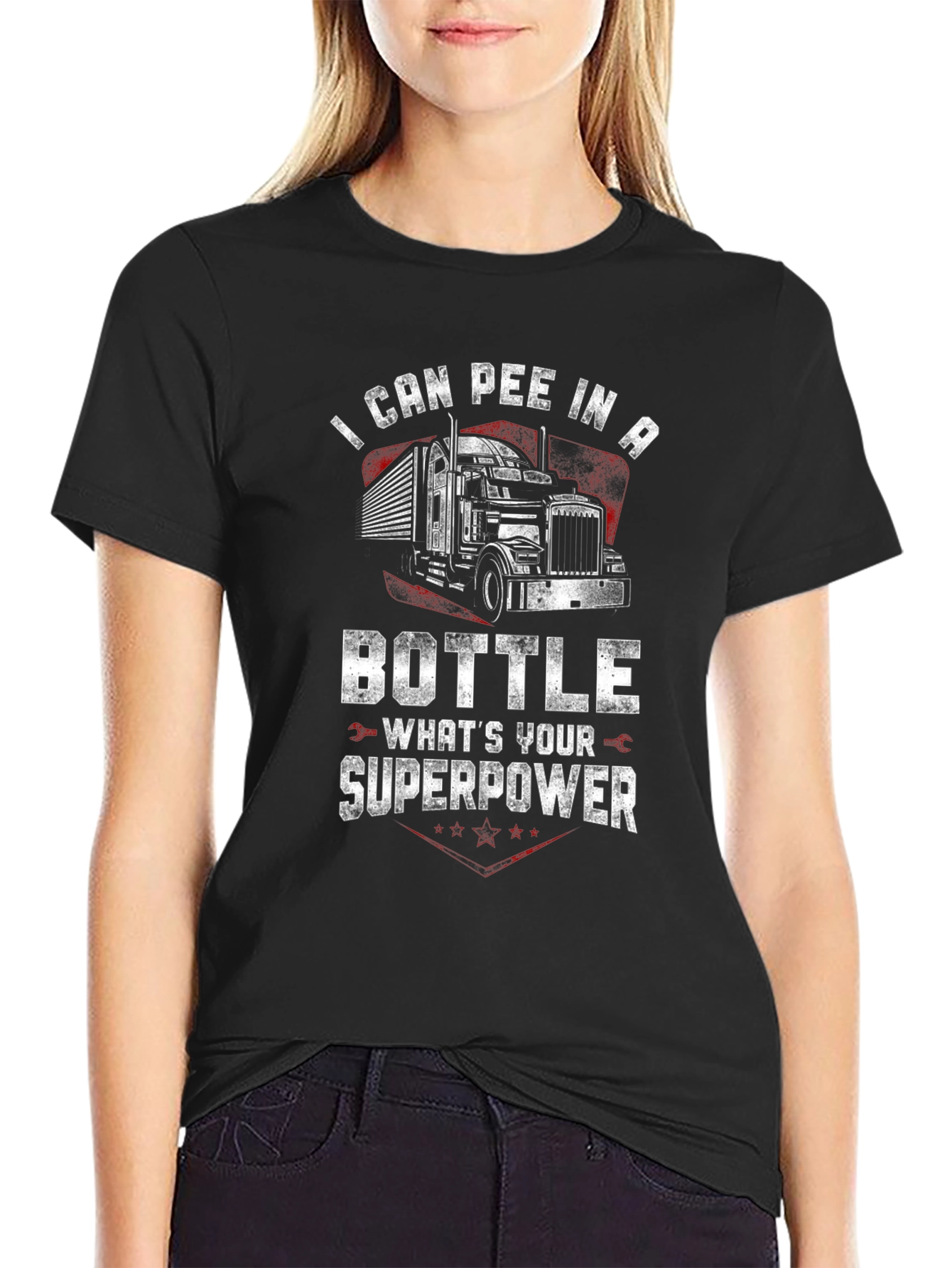Show off your unique sense of humor with this black novelty t-shirt. The design features a large truck graphic, overlaid with the humorous text, "I CAN PEE IN A BOTTLE - WHAT'S YOUR SUPERPOWER". Made from a soft fabric, this tee is perfect for casual wear. It's comfortable and sure to get a laugh. Great for truck drivers or anyone with a quirky personality. Wear it out with friends, at a casual event, or just lounging at home.