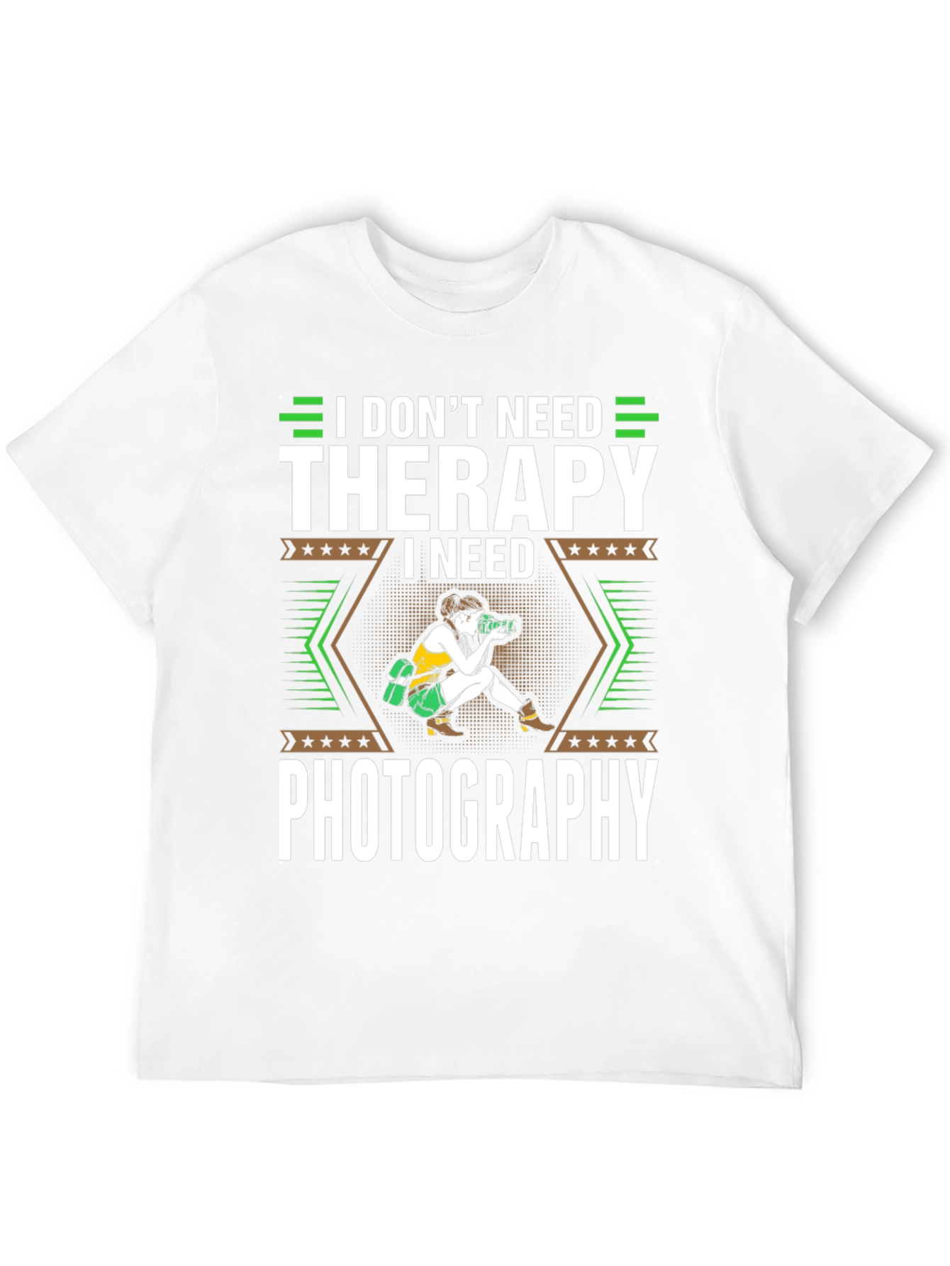 This eye-catching black t-shirt features a humorous design for photography enthusiasts. The bold, white text declares "I DON'T NEED THERAPY I NEED PHOTOGRAPHY," complemented by green graphic elements resembling camera focus lines. A central image depicts a photographer in action, adding visual interest. The design is framed by decorative star accents. Made from what appears to be a soft, comfortable cotton blend, this tee offers a relaxed fit. It's an ideal choice for casual wear, photography meetups, or as a gift for the shutterbug in your life. Show off your passion for photography with this unique and expressive t-shirt!