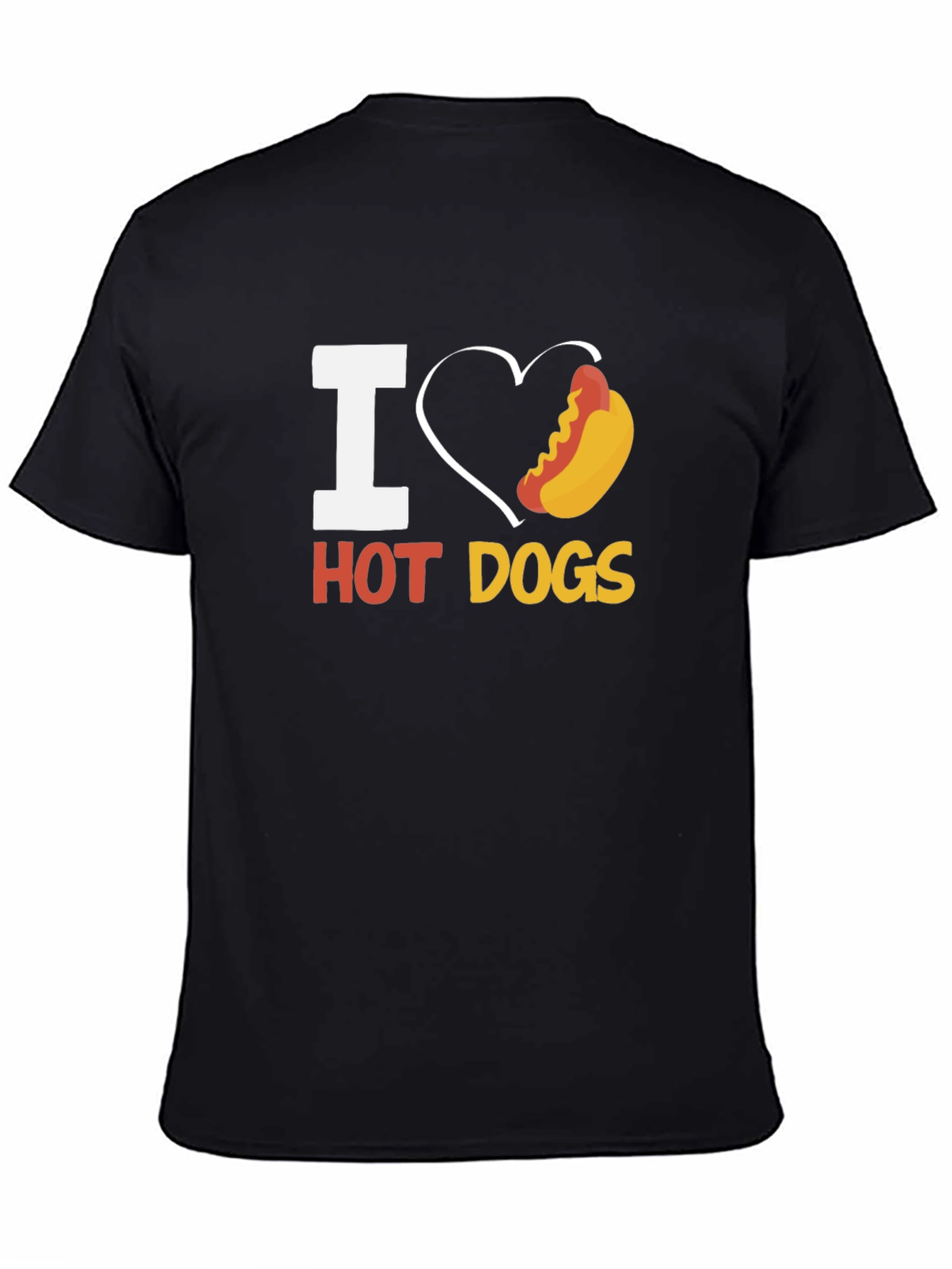 Show your love for hot dogs with this fun and stylish black t-shirt! This tee features a playful graphic design that incorporates a white "I" and a heart outline with a colorful hot dog image, followed by the text "HOT DOGS". Made from a comfortable-looking fabric, this short-sleeved shirt is perfect for casual wear, cookouts, or any occasion where you want to express your appreciation for this classic American treat. This t-shirt is sure to be a conversation starter. It is a great addition to any hot dog lover's wardrobe. Get yours today and wear your heart (and hot dog!) on your sleeve!