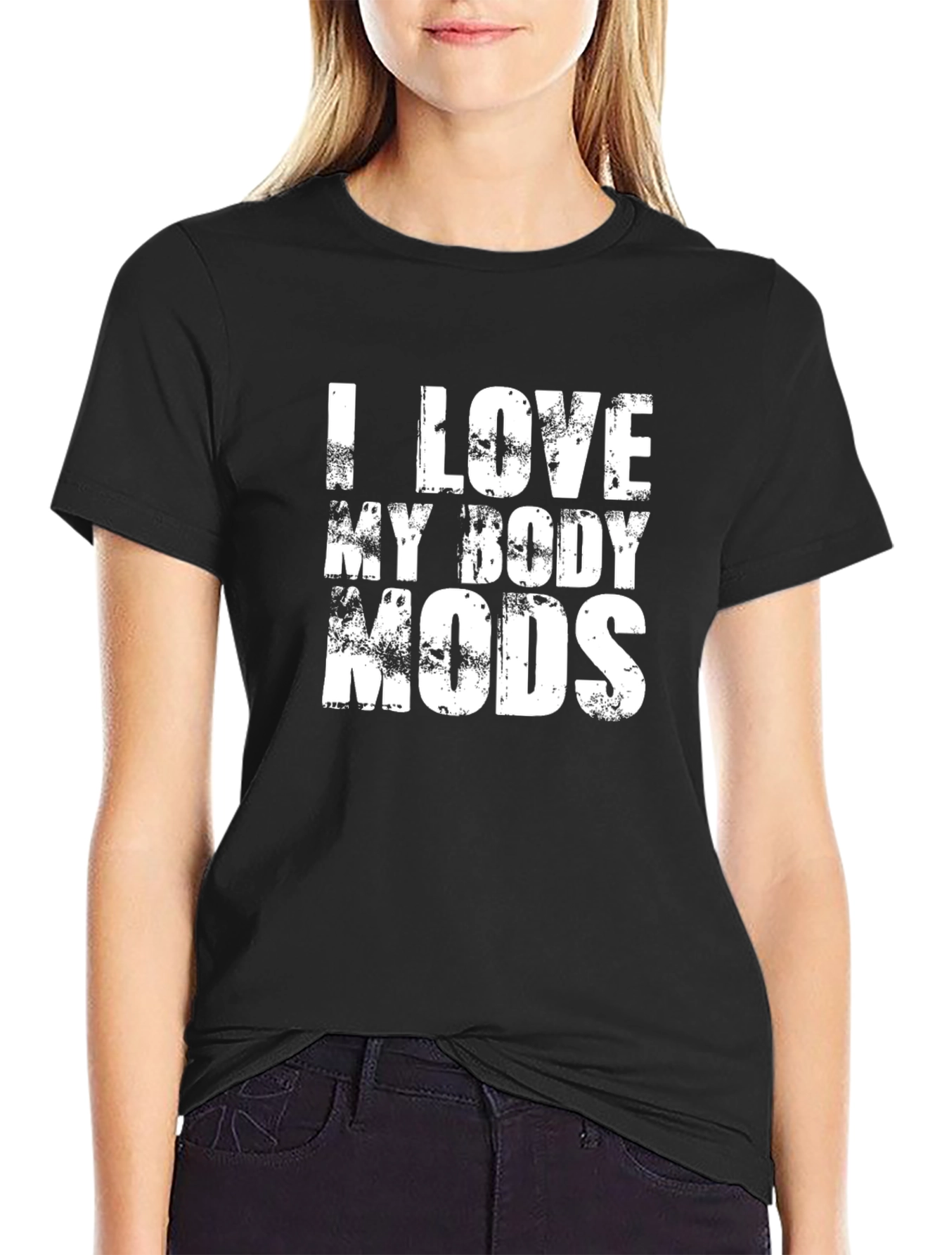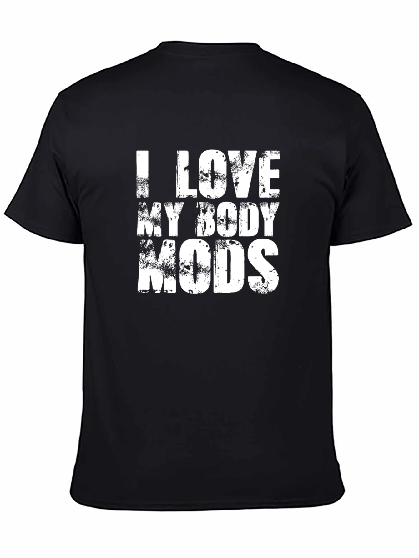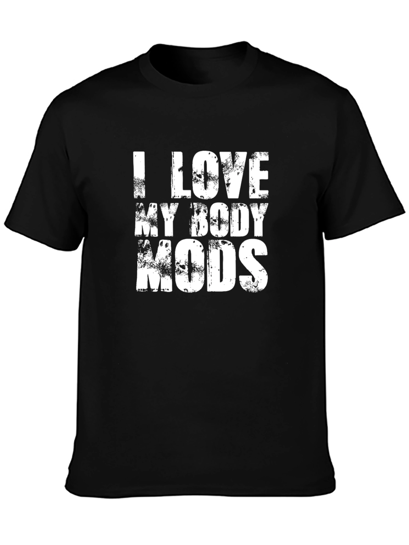 Show off your unique style with this eye-catching black graphic t-shirt! The shirt features a bold, distressed white print that reads "I LOVE MY BODY MODS." The classic crew neck and short sleeves offer a comfortable and casual fit, perfect for everyday wear. The shirt seems to be made of soft, breathable cotton. Whether you're into tattoos, piercings, or other forms of self-expression, this shirt is a great way to celebrate your individuality. Pair it with jeans or shorts for a laid-back look that's sure to turn heads.