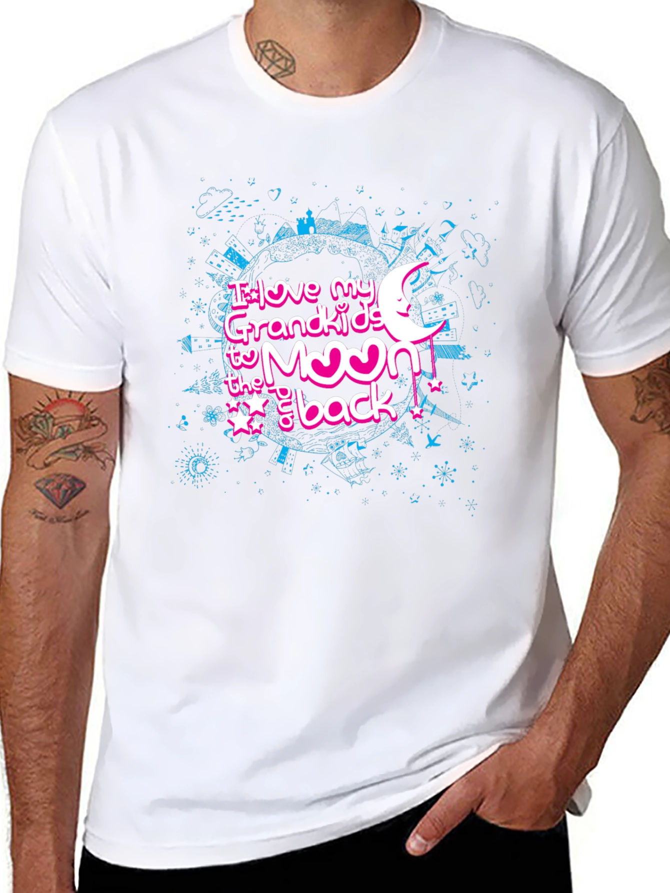 Show your love with this charming black T-shirt featuring a delightful graphic design! The shirt proudly proclaims "I love my Grandkids to the Moon and back," rendered in a playful mix of pink and white fonts, and adorned with a crescent moon and stars. The design is further enhanced by a light blue, whimsical backdrop of scattered doodles, adding a touch of fun and creativity. Made from comfortable, breathable fabric, this shirt is perfect for casual wear, family gatherings, or as a heartfelt gift for proud grandparents. Embrace comfort and showcase your affection in style!