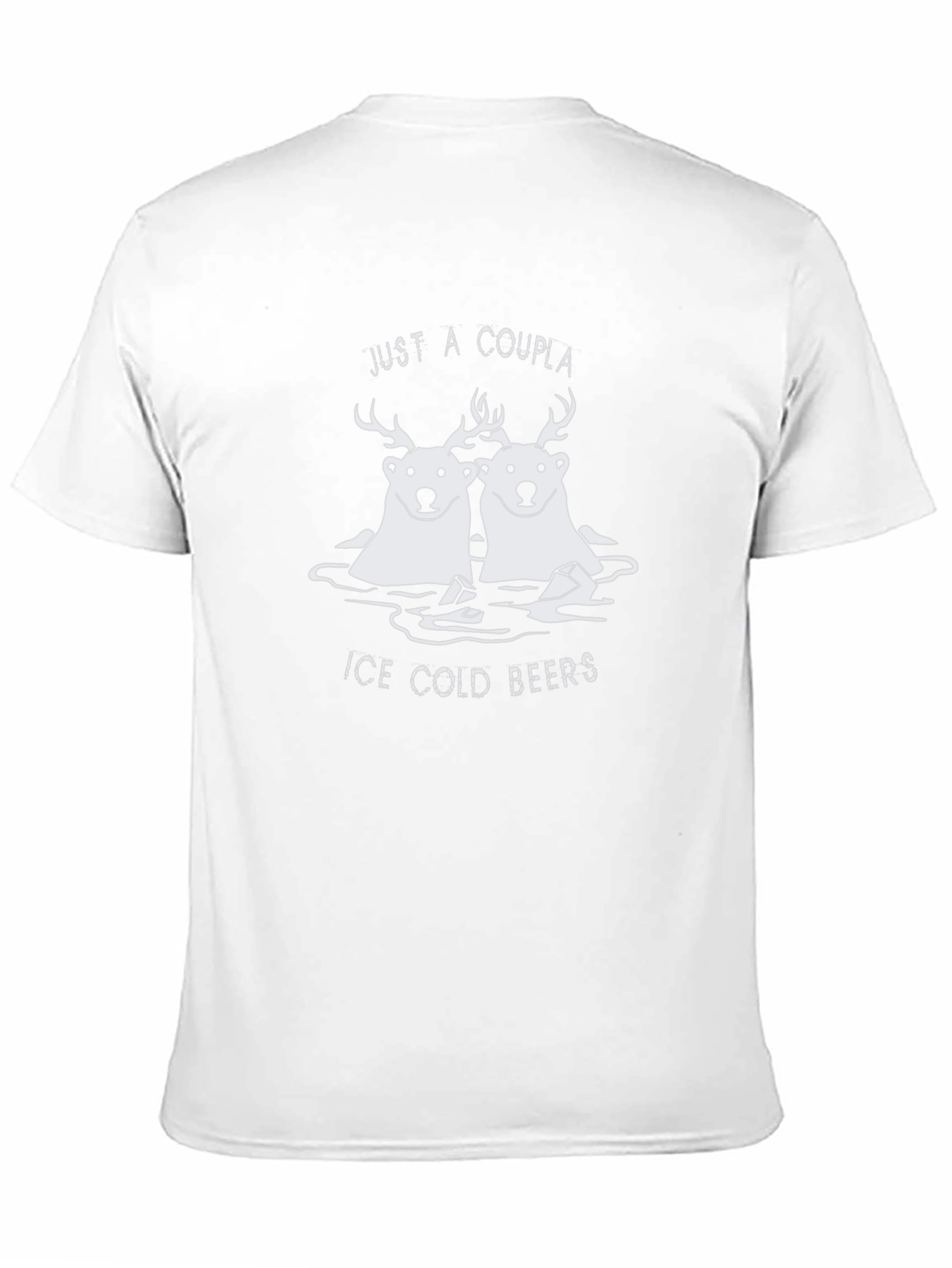 Stay cool and refreshed with this unique graphic t-shirt. Featuring a clever design of two polar bear heads with antlers enjoying ice-cold beers, this tee is perfect for casual wear. The design is printed in white on a dark-colored, likely black, soft fabric, offering a comfortable fit. The fun and quirky graphic makes it a great conversation starter. Ideal for a relaxed day out, a casual gathering with friends, or simply lounging at home. Show off your love for humor and good times with this eye-catching t-shirt!