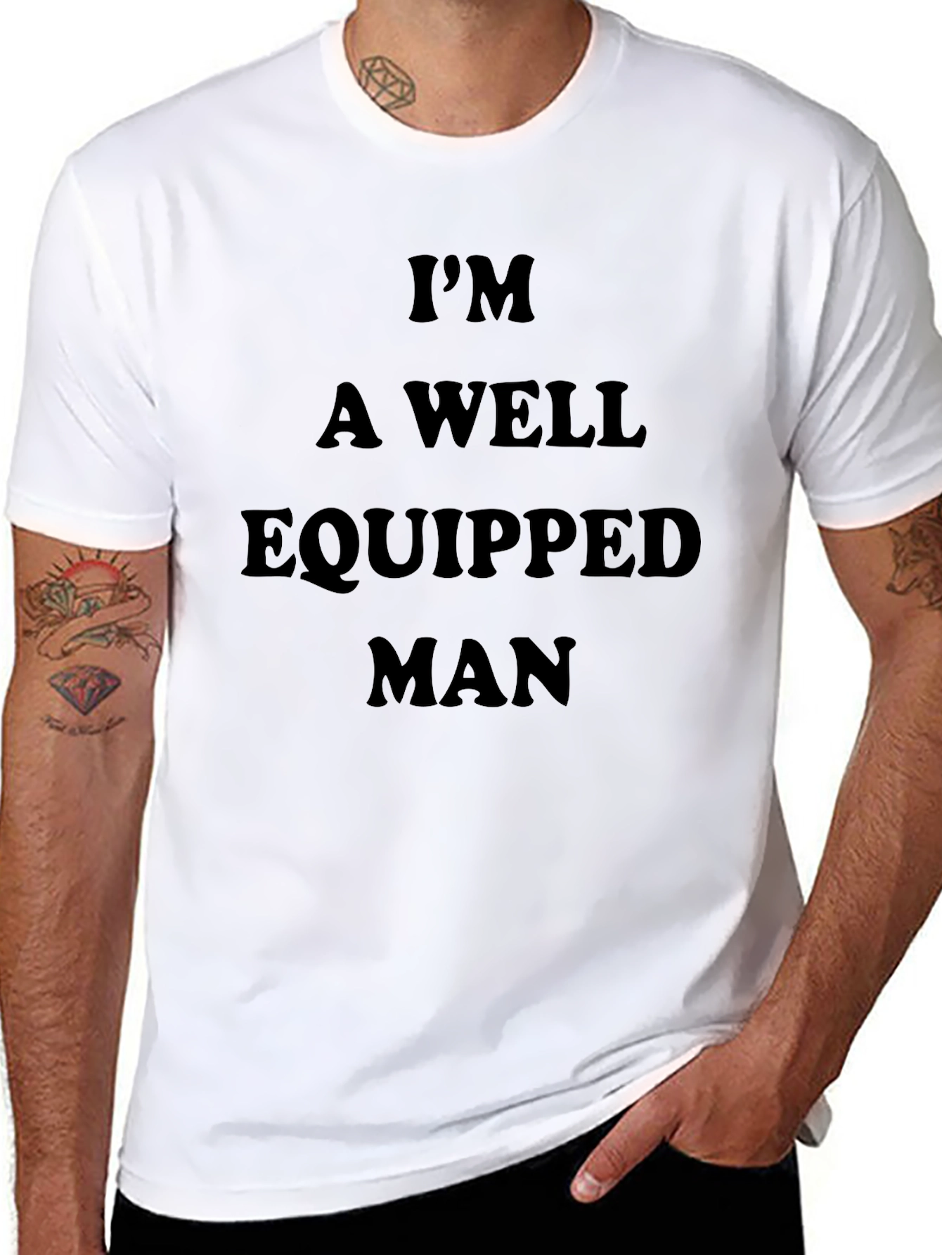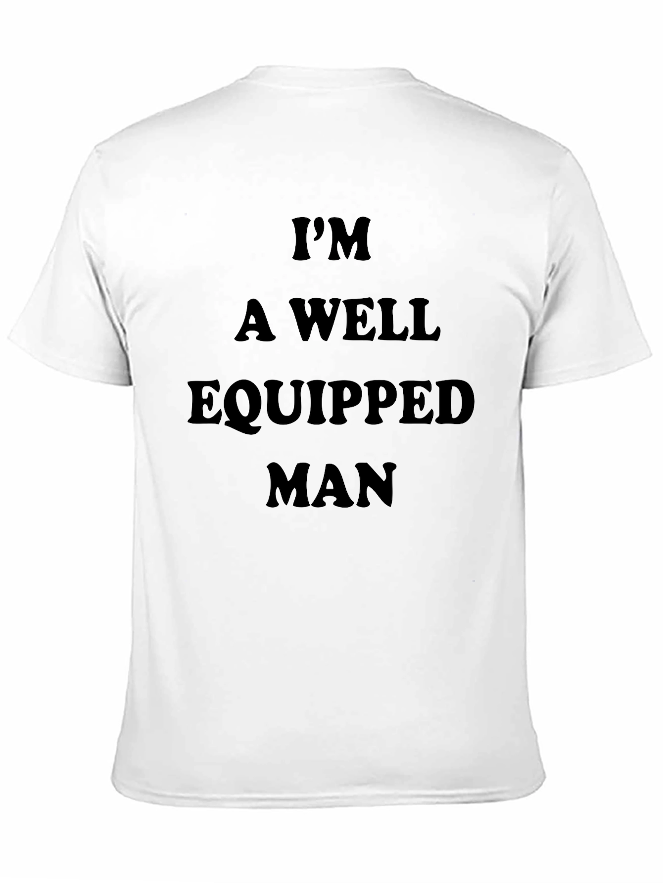 Show off your humor with this bold, black T-shirt. The shirt features the phrase "I'm A Well Equipped Man" in a dark, solid font across the chest. This short-sleeved tee has a classic fit and is likely made from soft, breathable cotton. This eye-catching shirt is perfect for casual outings, social events, or just lounging around. Make a statement with this funny and relatable tee.