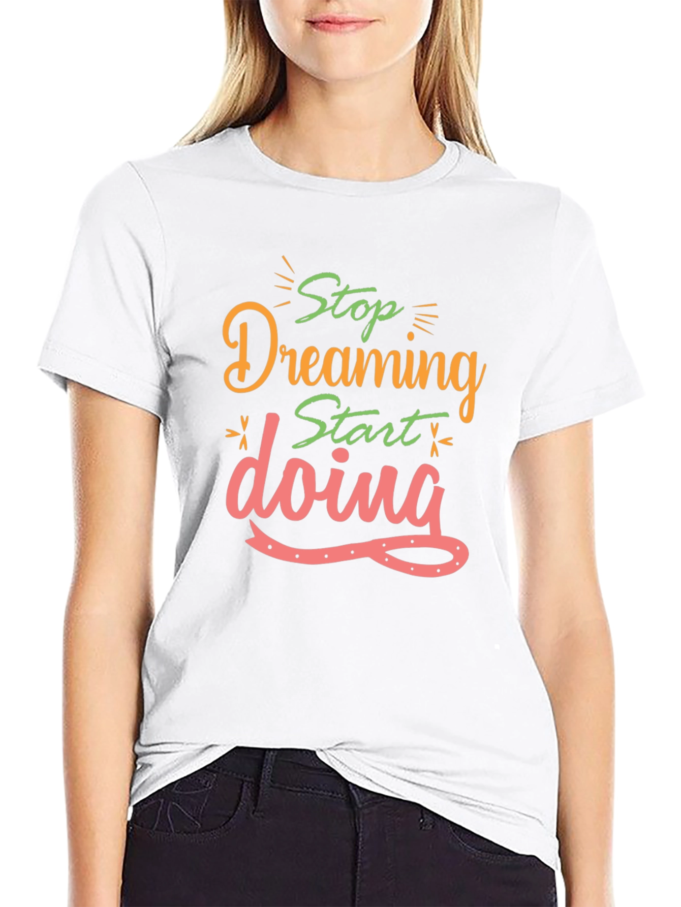 Embrace motivation with this stylish black t-shirt featuring an inspirational message. The tee showcases the words 'Stop Dreaming, Start Doing' in a vibrant color palette including shades of green, orange, and pink. The design is playful and eye-catching, making it perfect for casual wear. Made from comfortable fabric, this shirt is ideal for everyday activities, workouts, or simply relaxing at home. Inspire yourself and those around you with this unique and empowering garment. This is a perfect way to show the world that you are a motivated person and that you want to succeed in your goals.