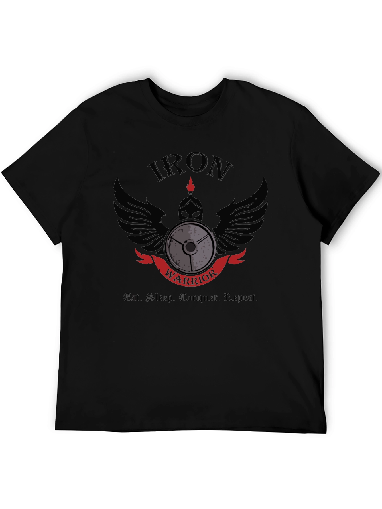Show off your dedication to fitness with this bold Iron Warrior T-shirt. This striking black tee features a unique graphic design incorporating a winged helmet, weight plate, and motivational text reading "Eat. Sleep. Conquer. Repeat.". Ideal for gym-goers, athletes, and anyone committed to a strong and healthy lifestyle. Constructed from a comfortable fabric, this shirt is perfect for workouts or everyday wear. Make a statement and inspire others with this powerful design!