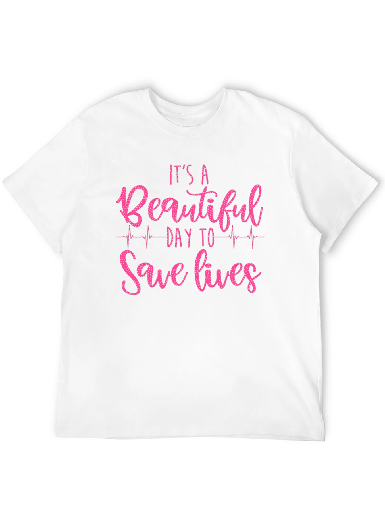 This stylish black t-shirt features a bold, eye-catching graphic design in bright pink. The phrase "It's a Beautiful Day to Save Lives" is prominently displayed, making it an ideal choice for medical professionals or anyone who appreciates uplifting messages. The design includes heart-rate style lines, adding a medical theme. Made from a soft fabric, this tee offers both comfort and style, perfect for casual wear, work events, or as a thoughtful gift. Show off your passion for saving lives with this unique and empowering t-shirt.