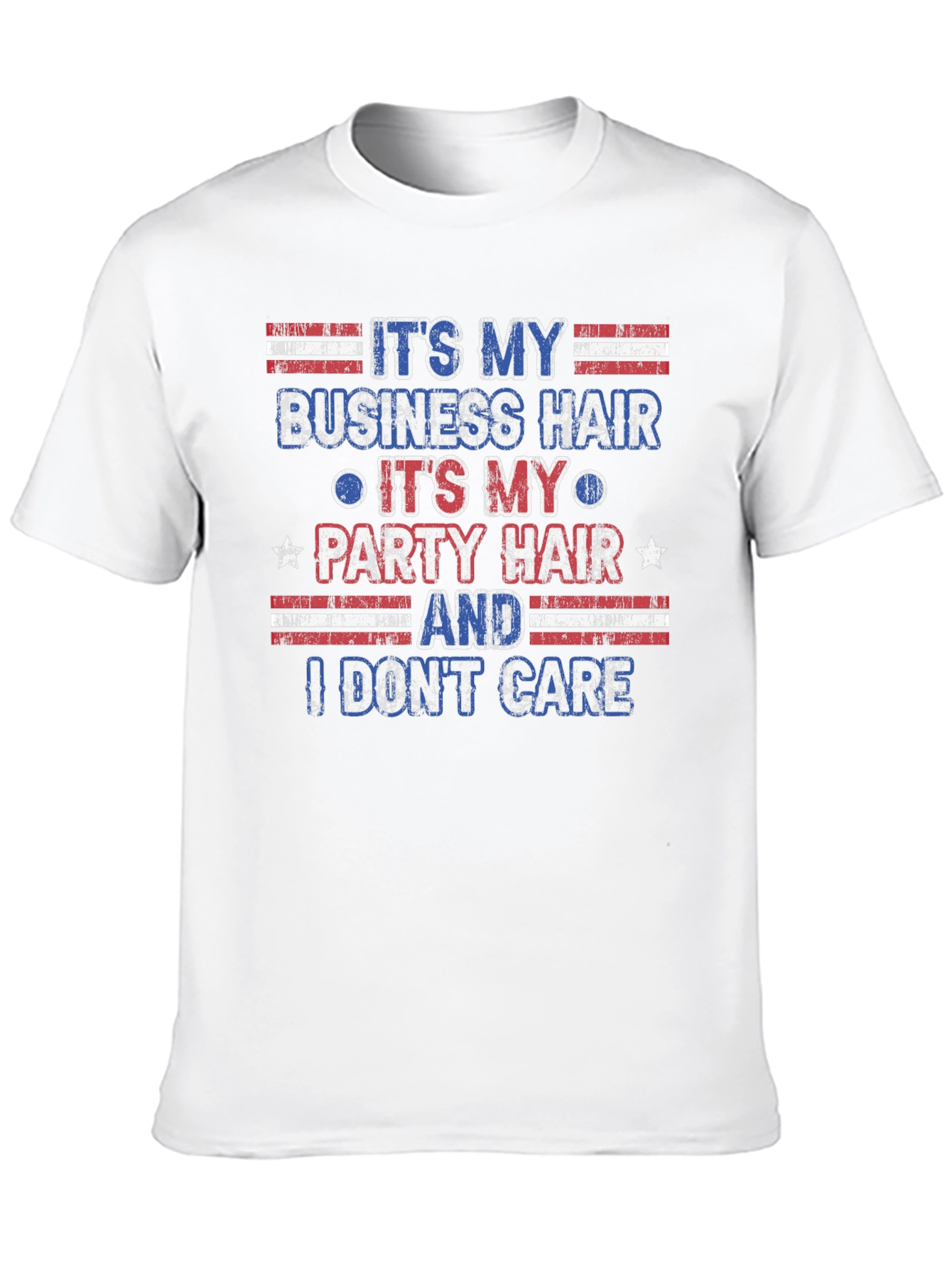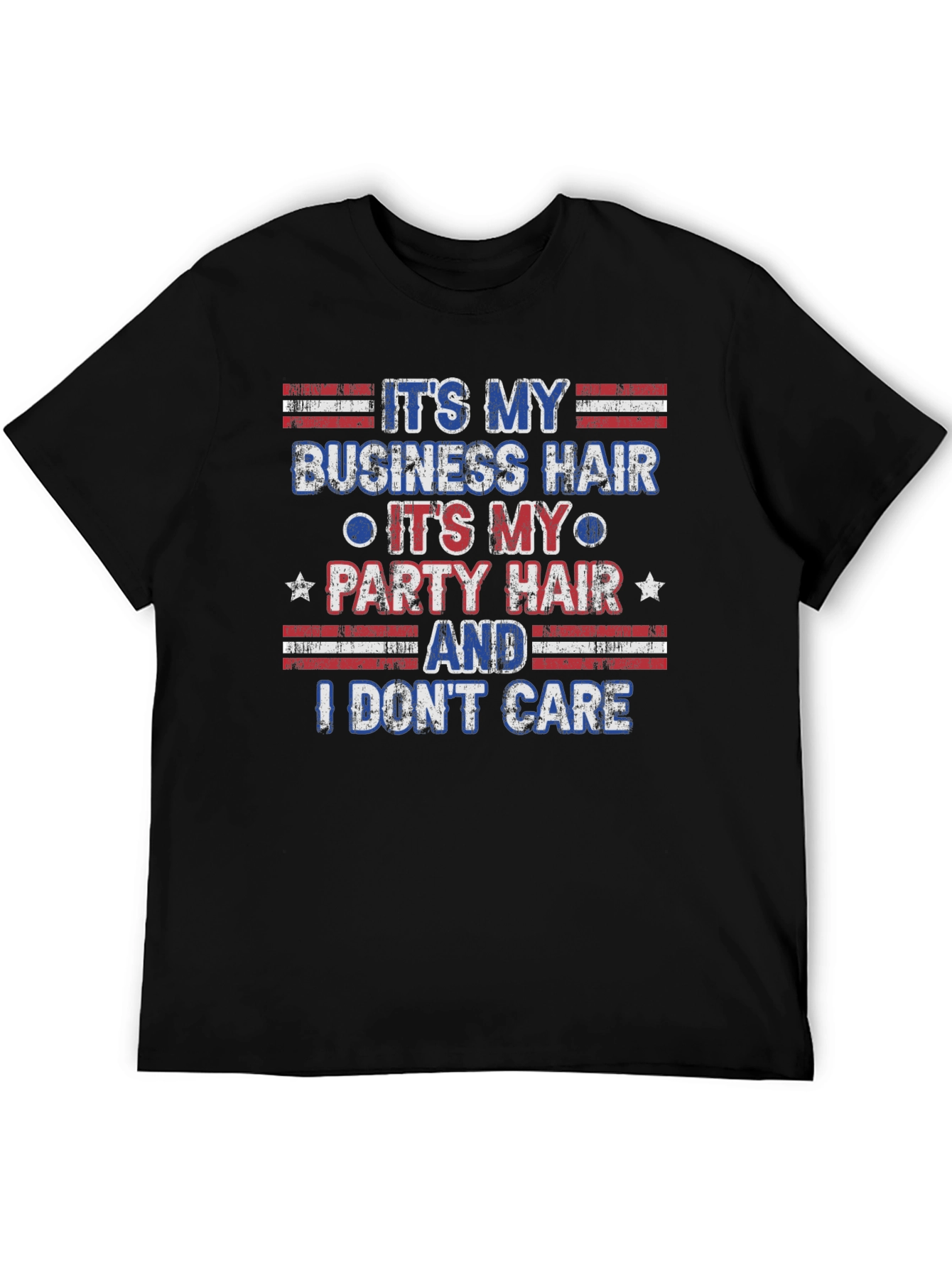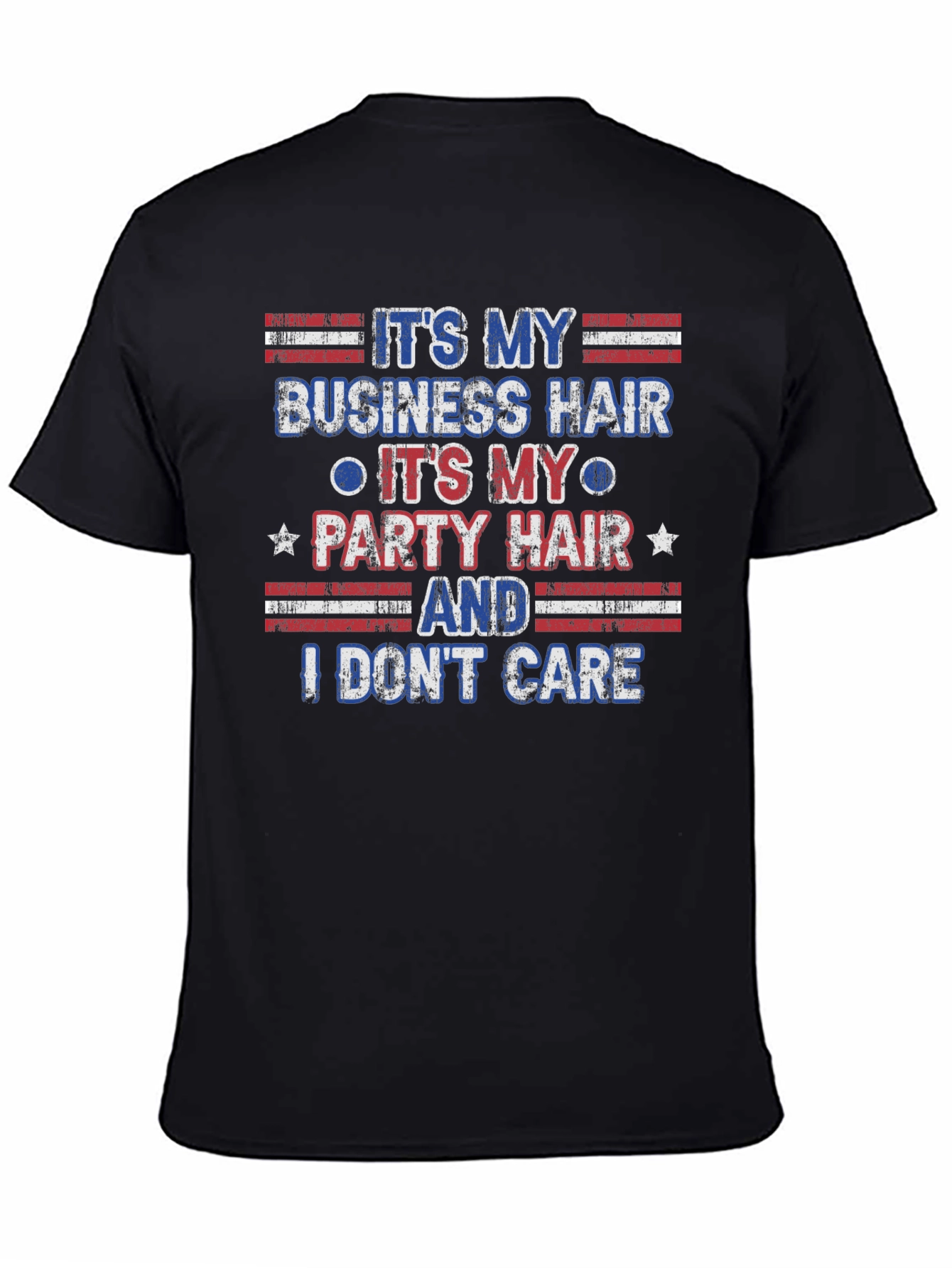 This stylish black t-shirt features a humorous slogan in a distressed, vintage-inspired font. The design reads "IT'S MY BUSINESS HAIR, IT'S MY PARTY HAIR, AND I DON'T CARE", punctuated by stars and circles. The text is colored in red, white, and blue, giving the shirt a patriotic or retro vibe. Made from a soft-looking fabric, this casual wear is perfect for expressing individuality and a carefree attitude. Ideal for casual outings, parties, or simply lounging around, it's a fun addition to any wardrobe. Pair it with jeans or shorts for a relaxed and trendy look.