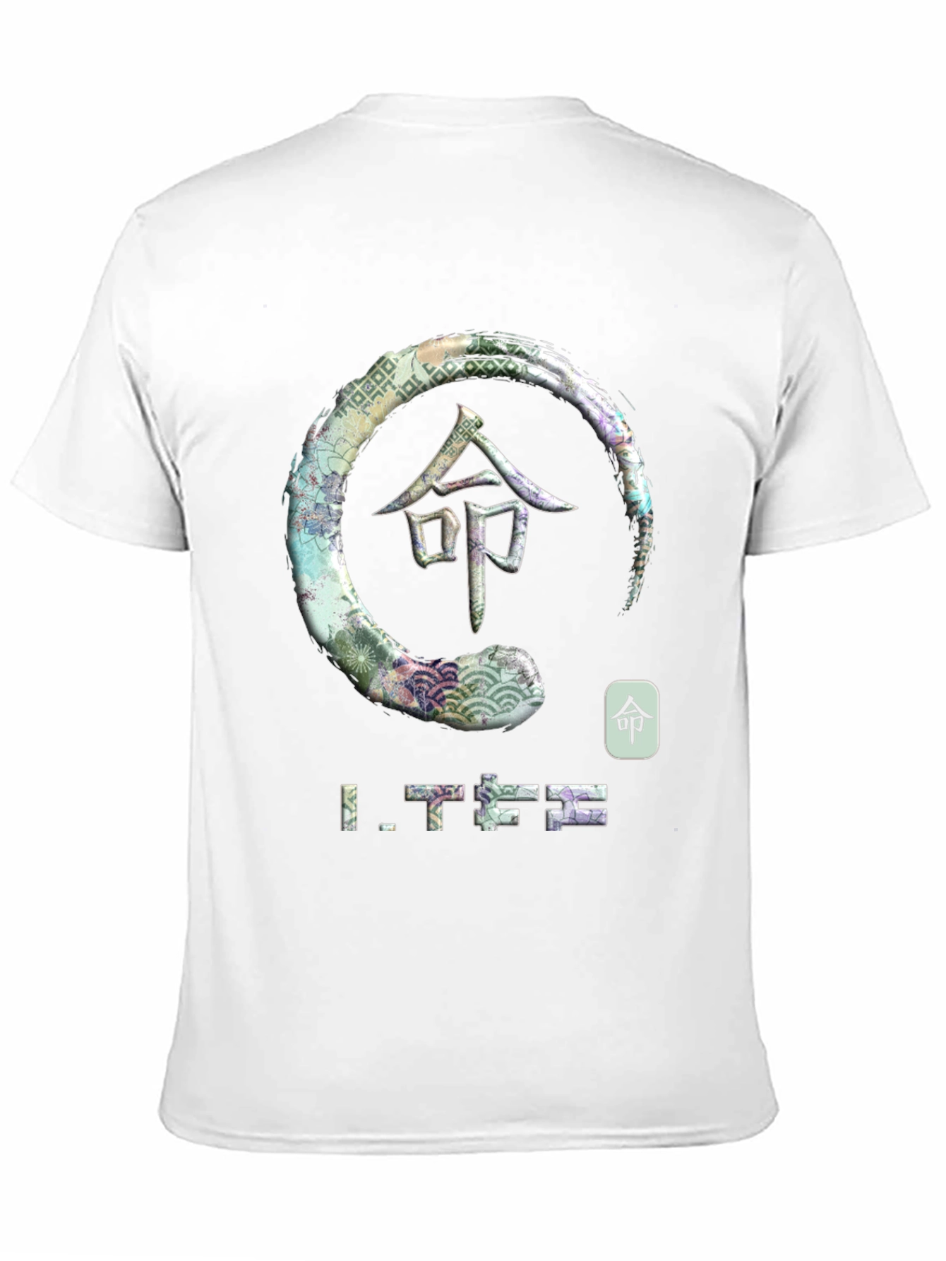 This striking black t-shirt features a captivating graphic design that blends traditional and contemporary elements. The central image showcases a textured ensō, or Zen circle, embellished with Japanese-inspired patterns and imagery. Superimposed within the circle is a bold kanji character, adding an element of mystique and cultural significance. Beneath the circle is a subtle text design. Made from a soft-looking fabric, this tee offers both comfort and style. Ideal for those who appreciate unique graphic tees with an artistic edge, this shirt is perfect for casual outings, artistic events, or as a statement piece in your everyday wardrobe. The design suggests a relaxed, yet thoughtful vibe. Stand out with this distinctive design!