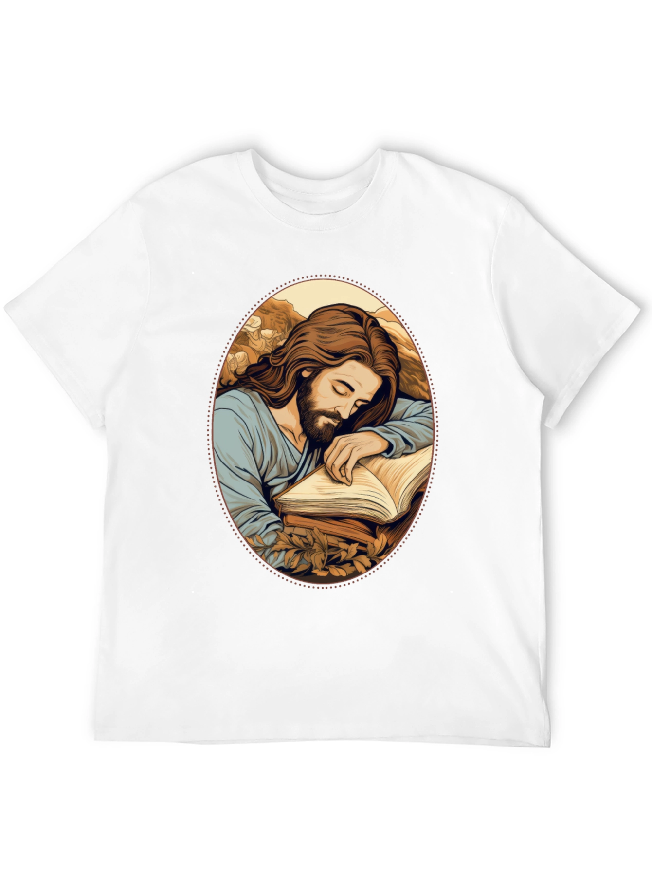 Embrace faith and style with this unique black t-shirt featuring a captivating image of Jesus asleep while leaning on a book. The detailed illustration showcases Jesus with long brown hair and beard, wearing a serene expression, and resting on an open book amidst a scenic backdrop. Crafted from comfortable fabric, this tee offers a relaxed fit for everyday wear. It's an ideal choice for expressing your spirituality or as a thoughtful gift for loved ones. Perfect for casual outings, church events, or simply as a meaningful addition to your wardrobe.