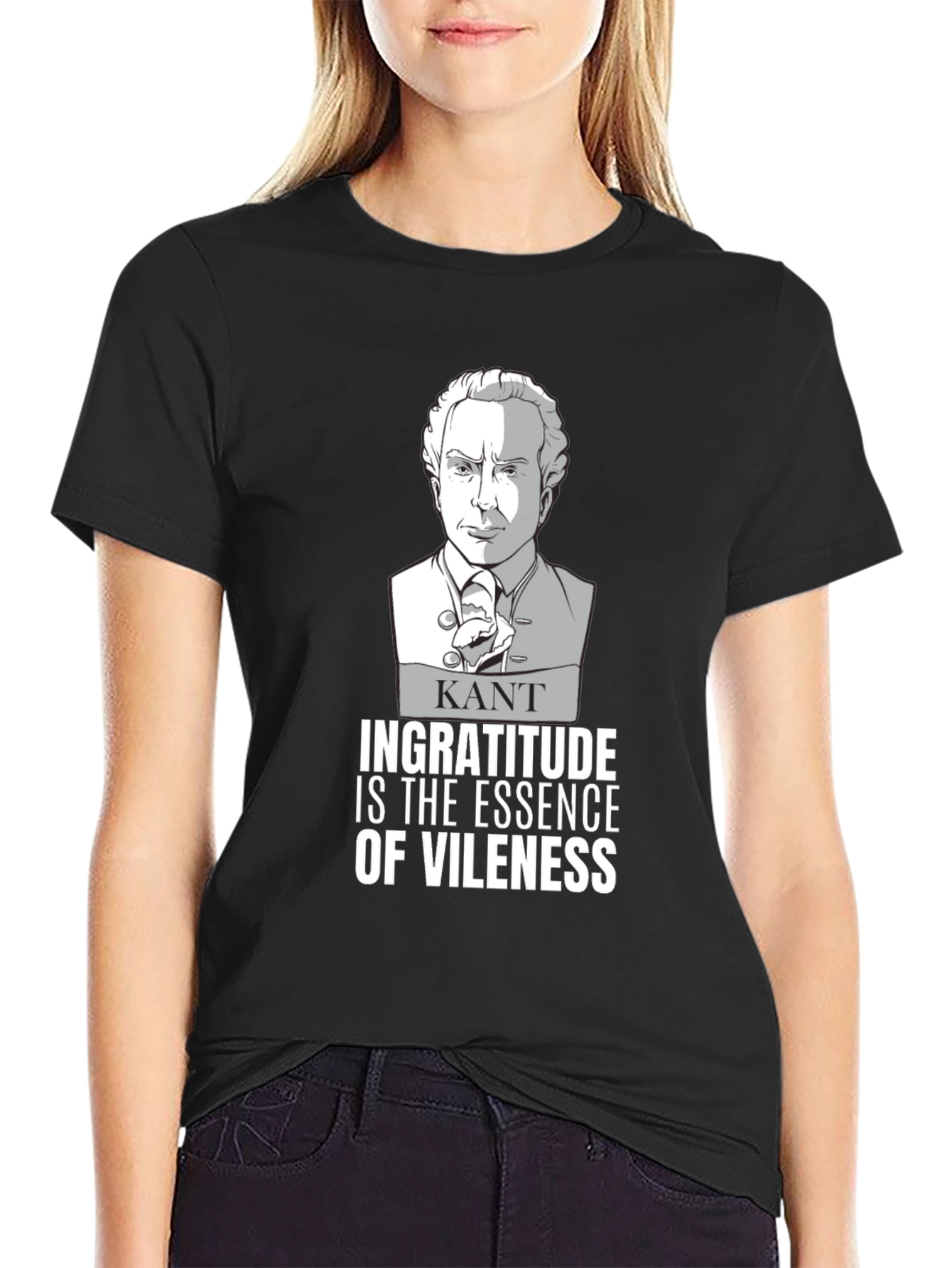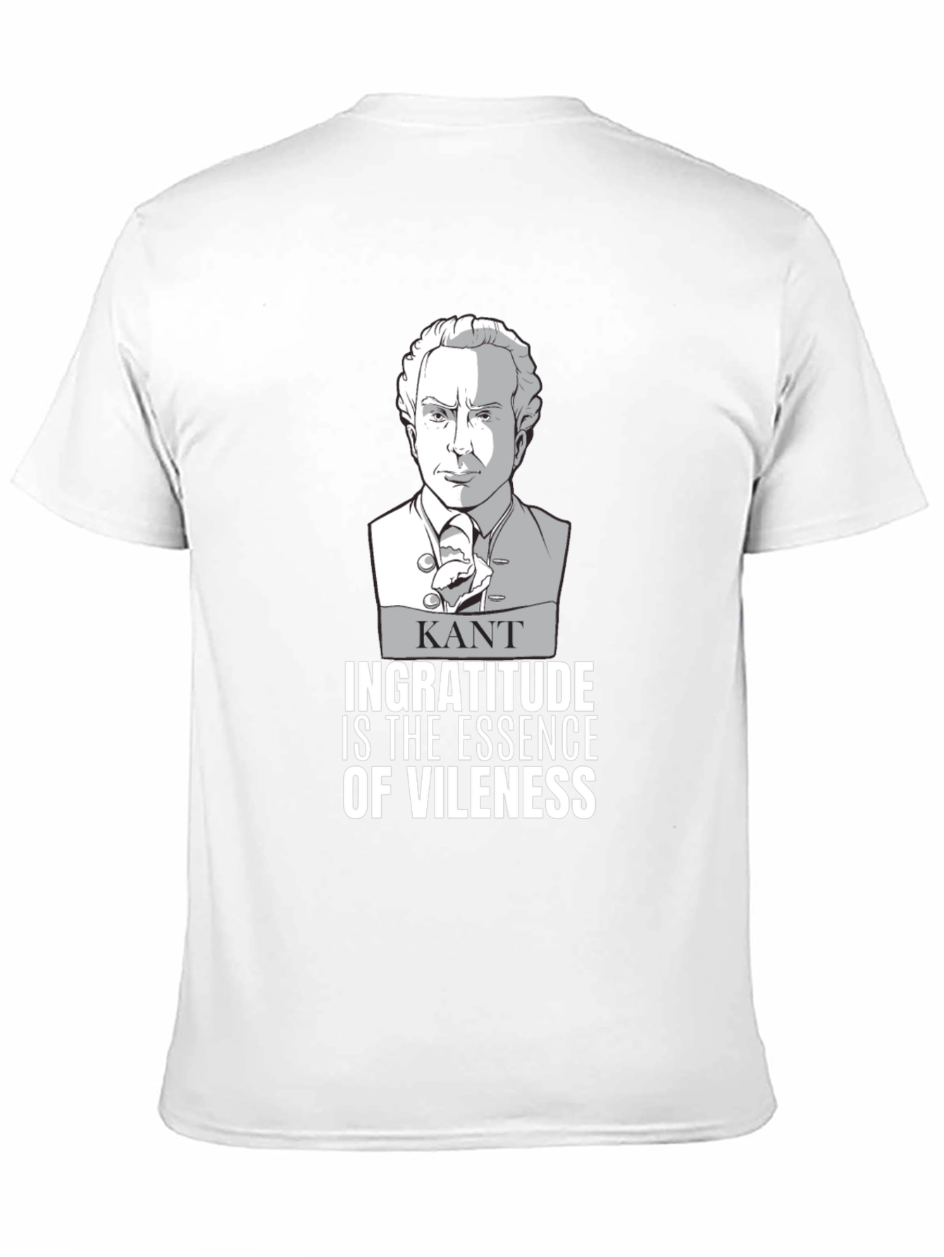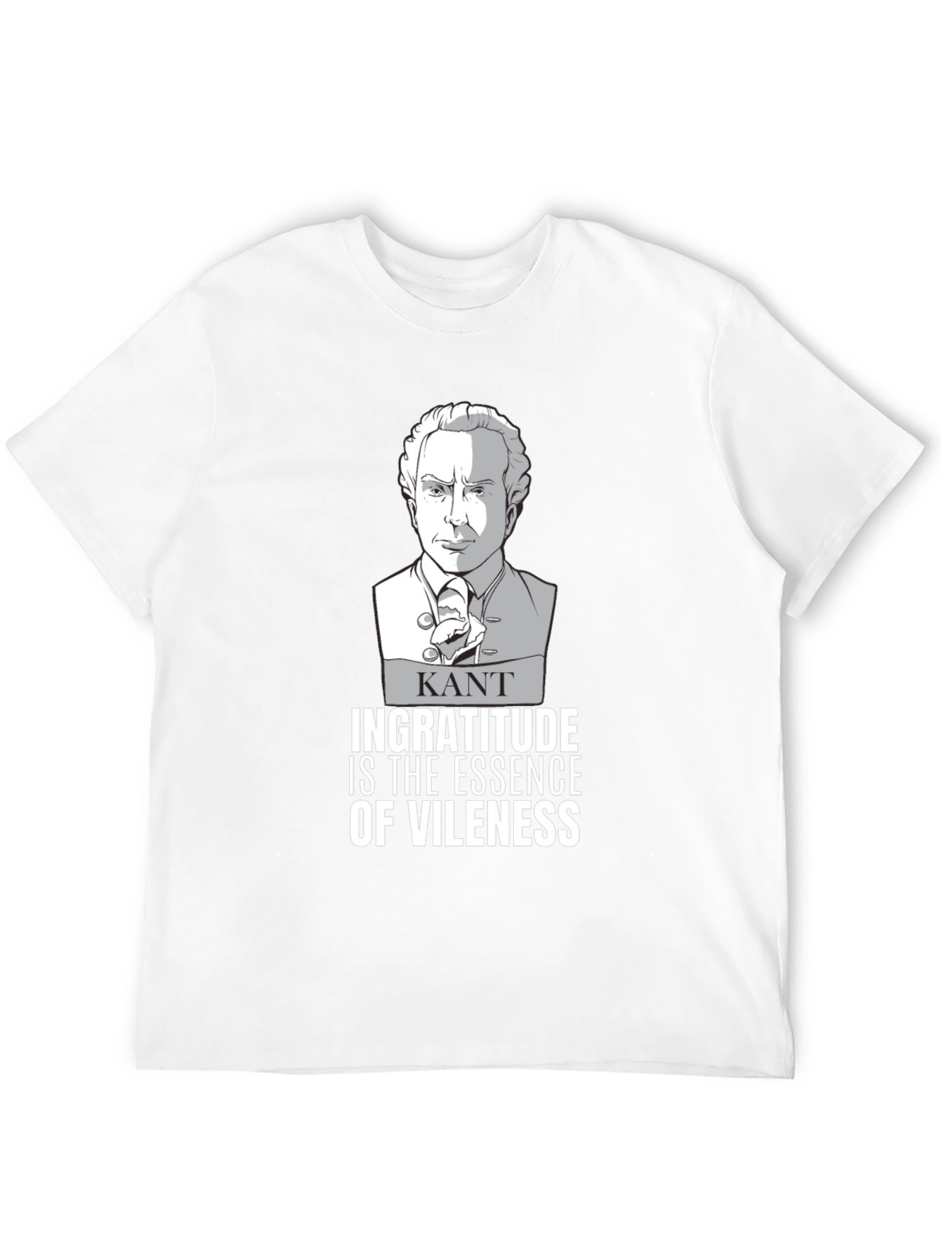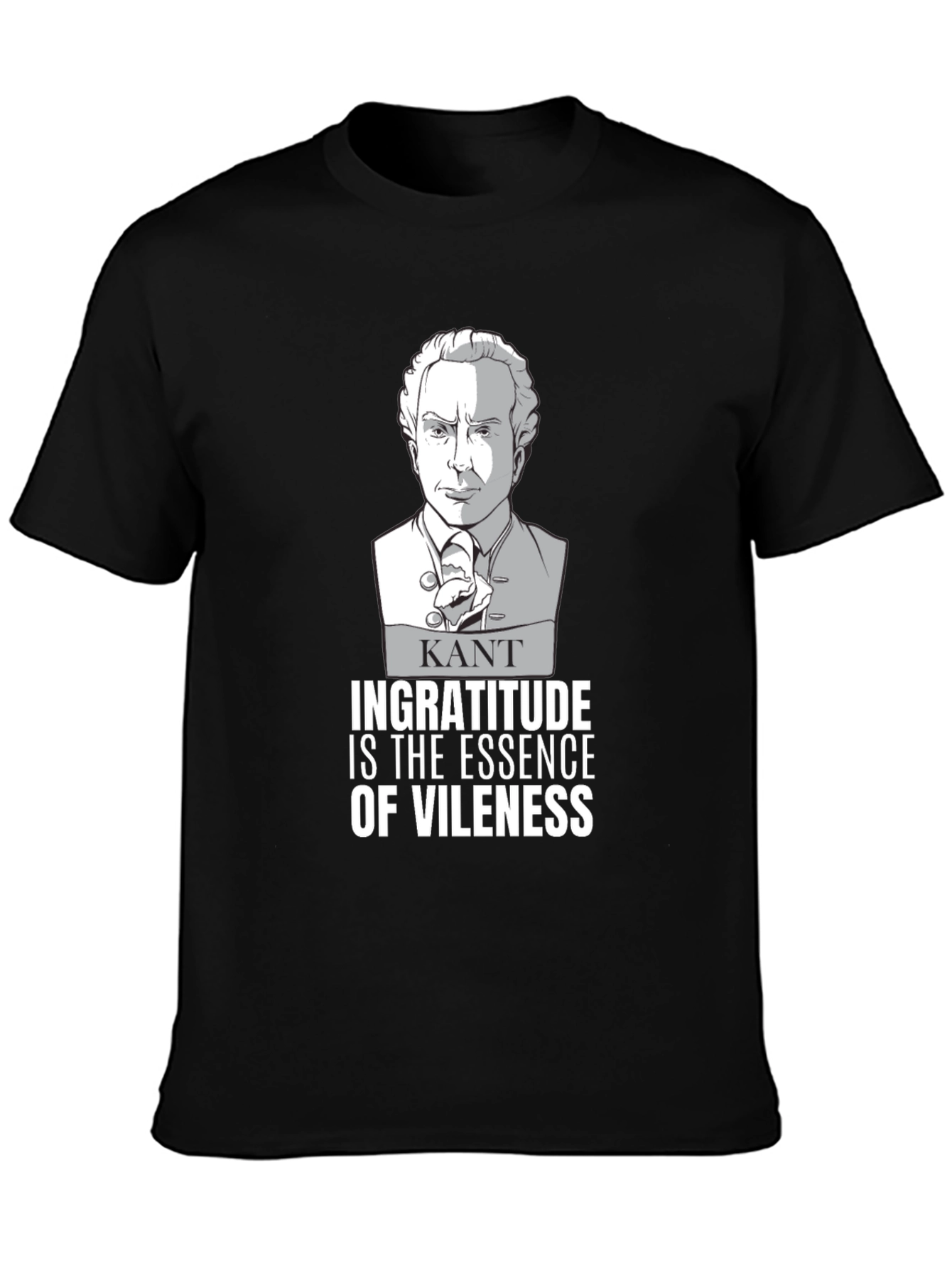 Show off your philosophical side with this unique graphic t-shirt. The shirt features an illustrated portrait of Immanuel Kant, along with the quote "Ingratitude is the essence of vileness". This tee is made from a comfortable material and has a classic fit. Perfect for students, professors, or anyone who appreciates philosophy and a good quote. This t-shirt is sure to spark conversations and showcase your unique sense of style. A great addition to any wardrobe, it’s ideal for casual wear, lectures, or philosophical discussions.
