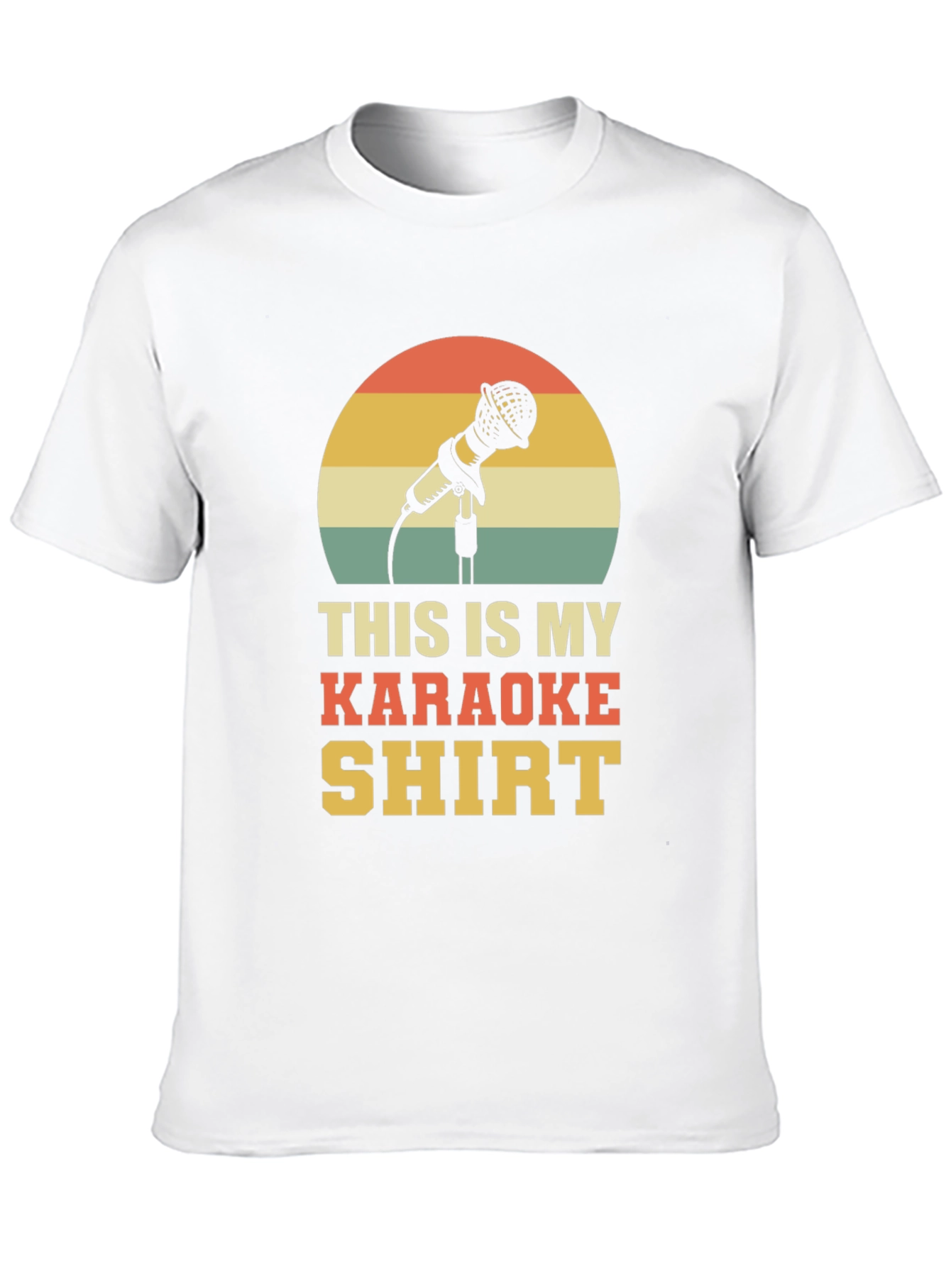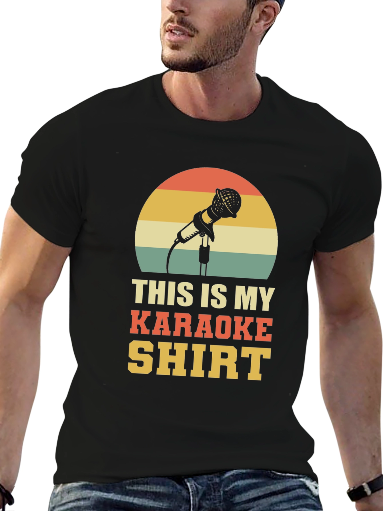 Get ready to sing your heart out with this fun karaoke shirt! The black tee features a retro-style microphone graphic set against a vintage-inspired sun backdrop with stripes of orange, yellow, and teal. Bold text proclaims "THIS IS MY KARAOKE SHIRT," making it clear you're ready for a night of musical fun. The design has a slightly distressed, retro vibe. Perfect for karaoke nights, parties, or just showing off your love of music. It's a comfortable and stylish way to express your passion for singing.