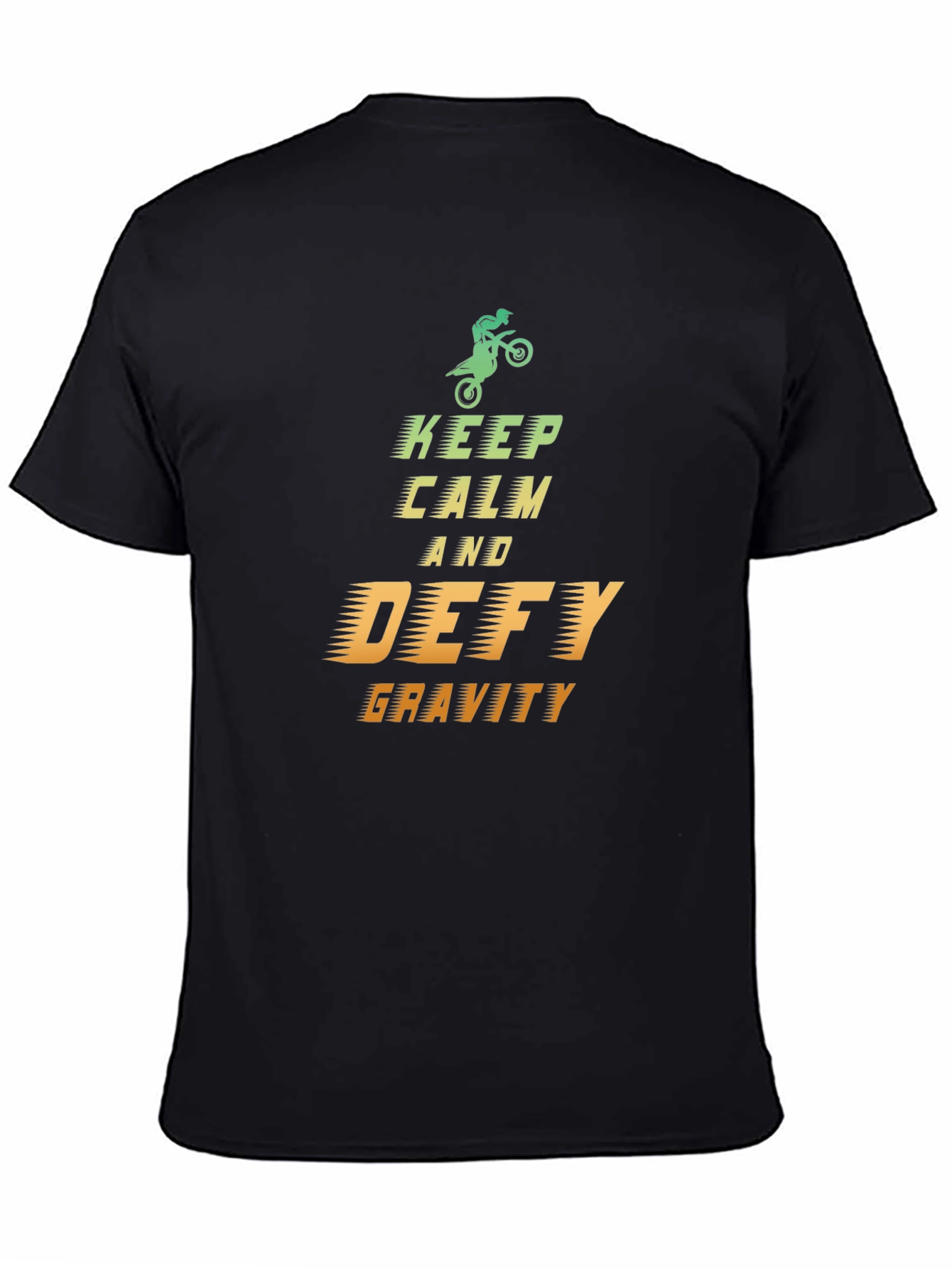 This sleek black t-shirt features a unique graphic design that blends adventure and relaxation. The design includes a vibrant depiction of a person on a motocross bike, coupled with the words "KEEP CALM AND DEFY GRAVITY." The text transitions in color from green to yellow, adding a dynamic visual element. Made from a soft-looking fabric, this shirt offers both style and comfort. Ideal for casual wear, sports enthusiasts, or anyone with a bold spirit, this t-shirt is a great way to express individuality and passion. Wear it to the gym, a casual outing, or simply as a comfortable everyday piece.
