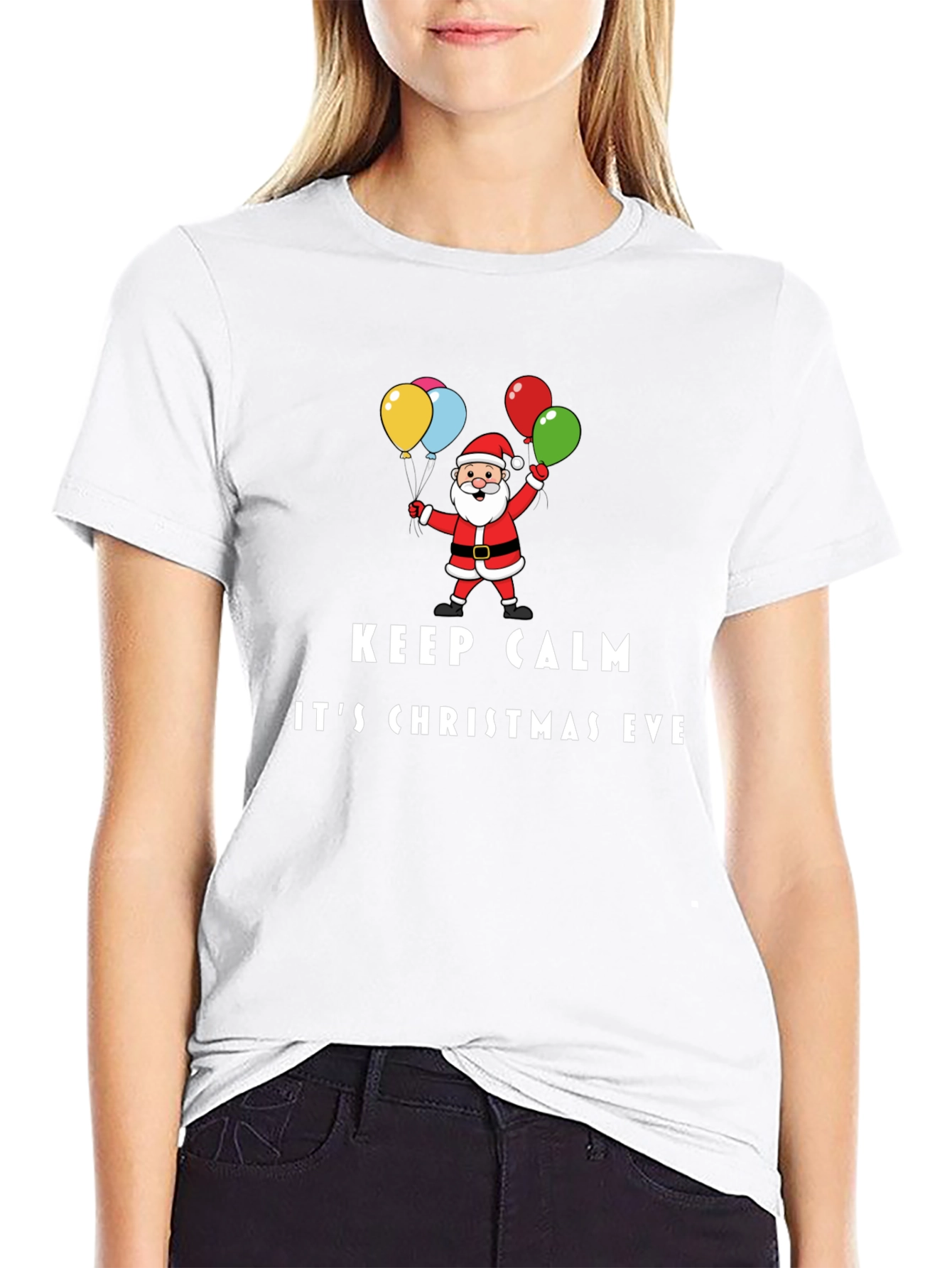 Spread holiday cheer with this festive black t-shirt! The design features a cheerful Santa Claus holding colorful balloons, paired with the playful text "KEEP CALM IT'S CHRISTMAS EVE". Perfect for holiday parties, family gatherings, or just showing off your Christmas spirit, this t-shirt is sure to be a hit. The shirt is made of soft, breathable fabric for comfortable wear all day long. Get yours now and let the holiday celebrations begin!