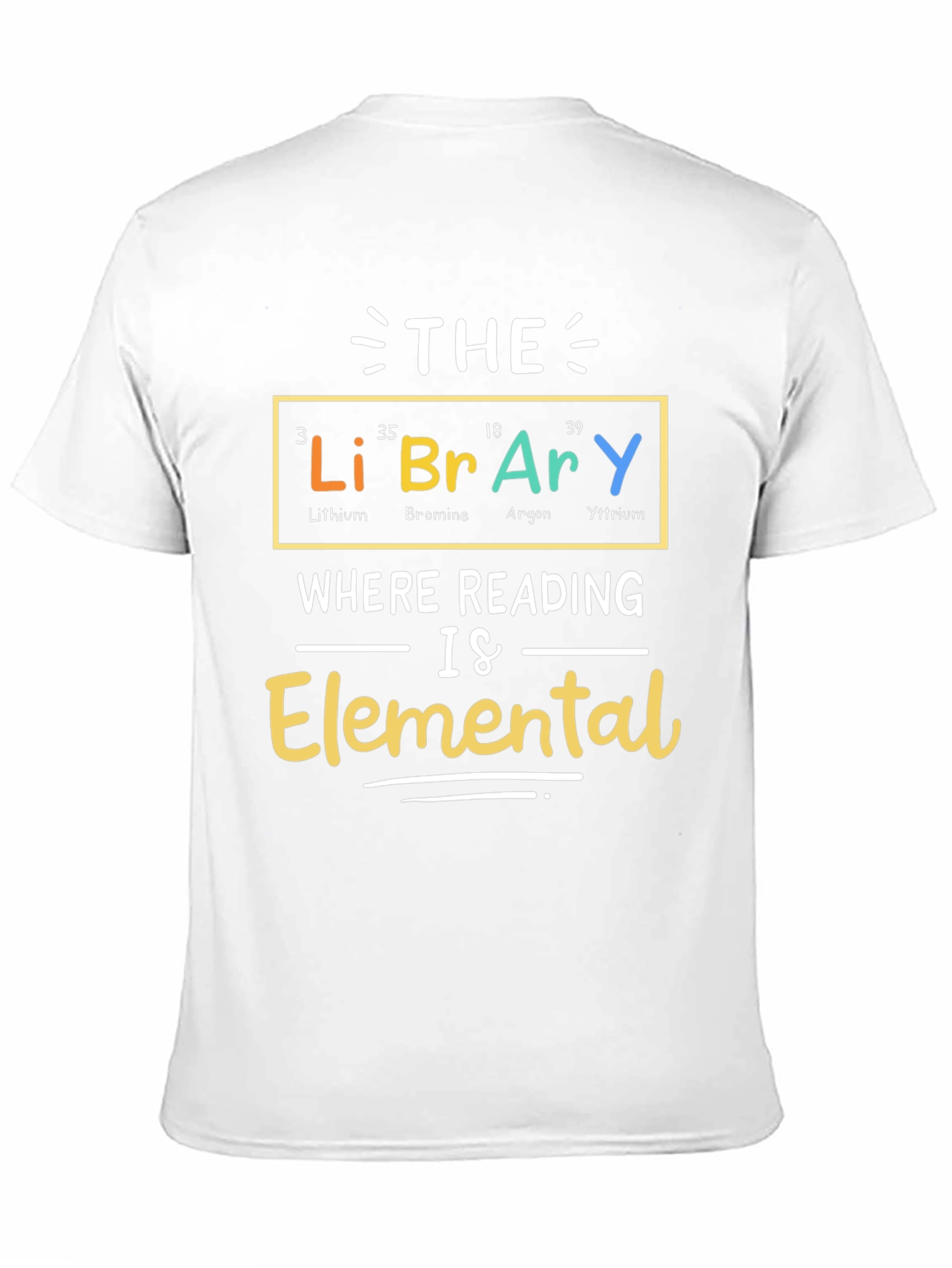 This black T-shirt features a colorful and playful design. It showcases the word "THE" above the word "LIBRARY", with the letters represented by elements from the periodic table: Lithium (Li), Bromine (Br), Argon (Ar), and Yttrium (Y). Below that, the phrase "WHERE READING IS Elemental" is written in a clear, stylish font. This shirt is perfect for librarians, book lovers, science enthusiasts, or anyone who appreciates a clever and unique design. The vibrant colors and educational theme make it a great conversation starter, and the classic cut ensures a comfortable fit. Wear it to the library, book club meetings, school, or casual outings to express your love of reading and science.
