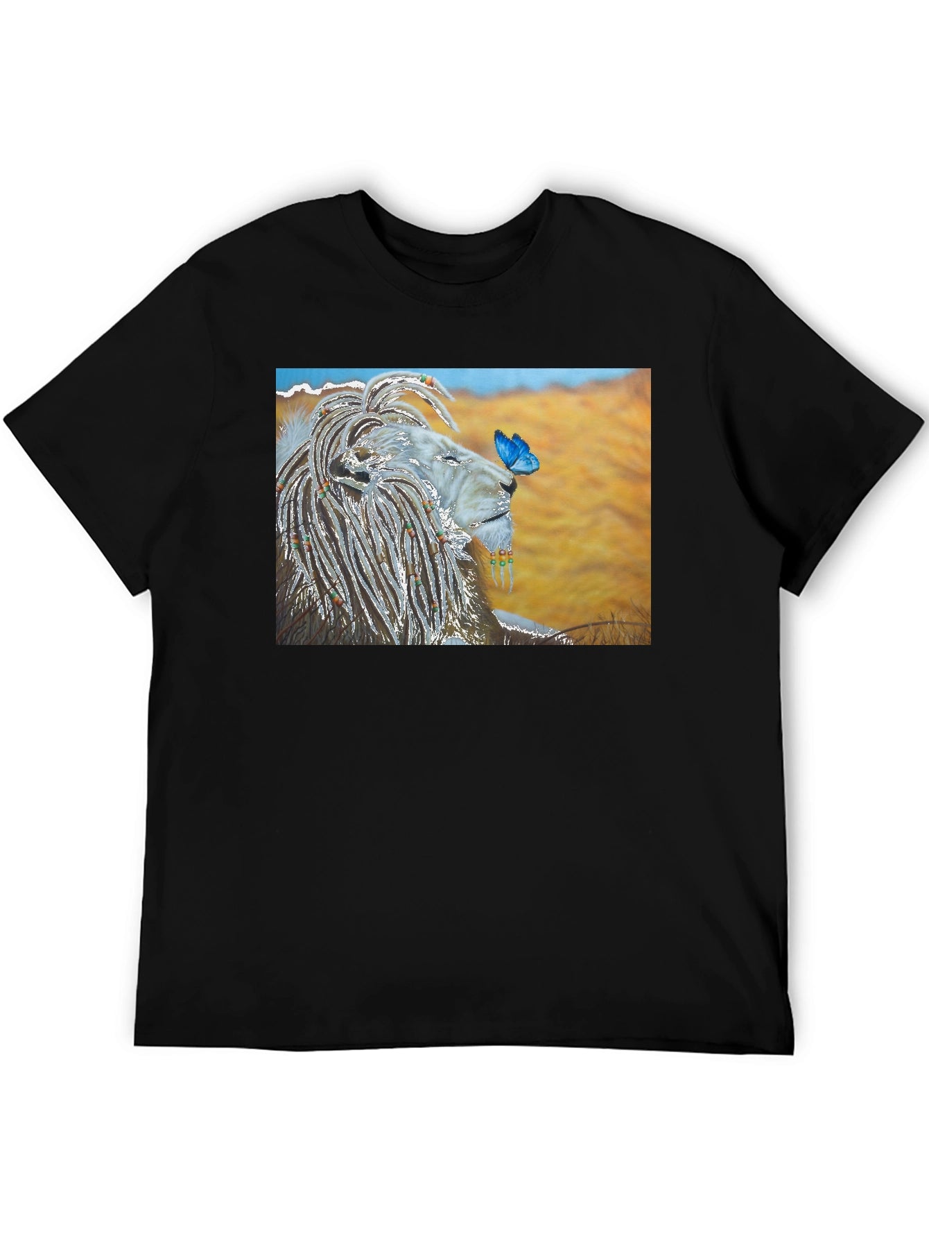 Showcase your unique style with this striking black t-shirt. The tee features a captivating graphic of a white lion adorned with dreadlocks, a blue butterfly perched delicately on its nose against a soft, sun-kissed backdrop. The intricate design provides a visually appealing focal point, making it a great conversation starter. Crafted from comfortable fabric, this tee offers a relaxed fit, perfect for casual wear. Stand out from the crowd and embrace a touch of the wild with this captivating t-shirt.