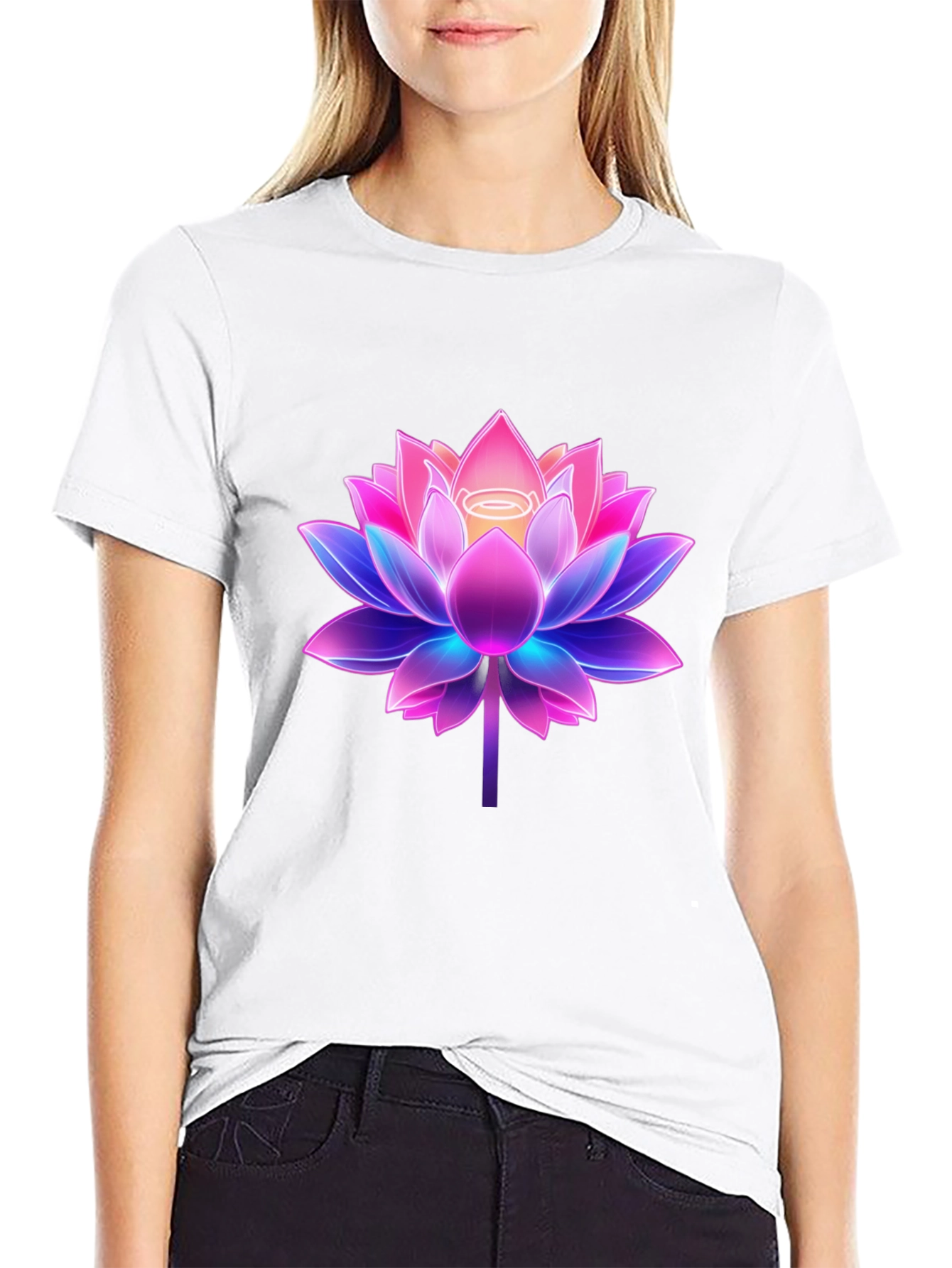 Showcase your unique style with this eye-catching black t-shirt featuring a vibrant lotus flower graphic. The eye-catching design boasts neon shades of pink, purple and blue, creating a stunning visual effect. Made from a comfortable cotton blend, this tee offers a relaxed fit perfect for everyday wear. Its versatile design makes it ideal for casual outings, concerts, or simply lounging at home. Make a statement with this unique tee. Express your inner peace and love for floral designs with this unique piece!
