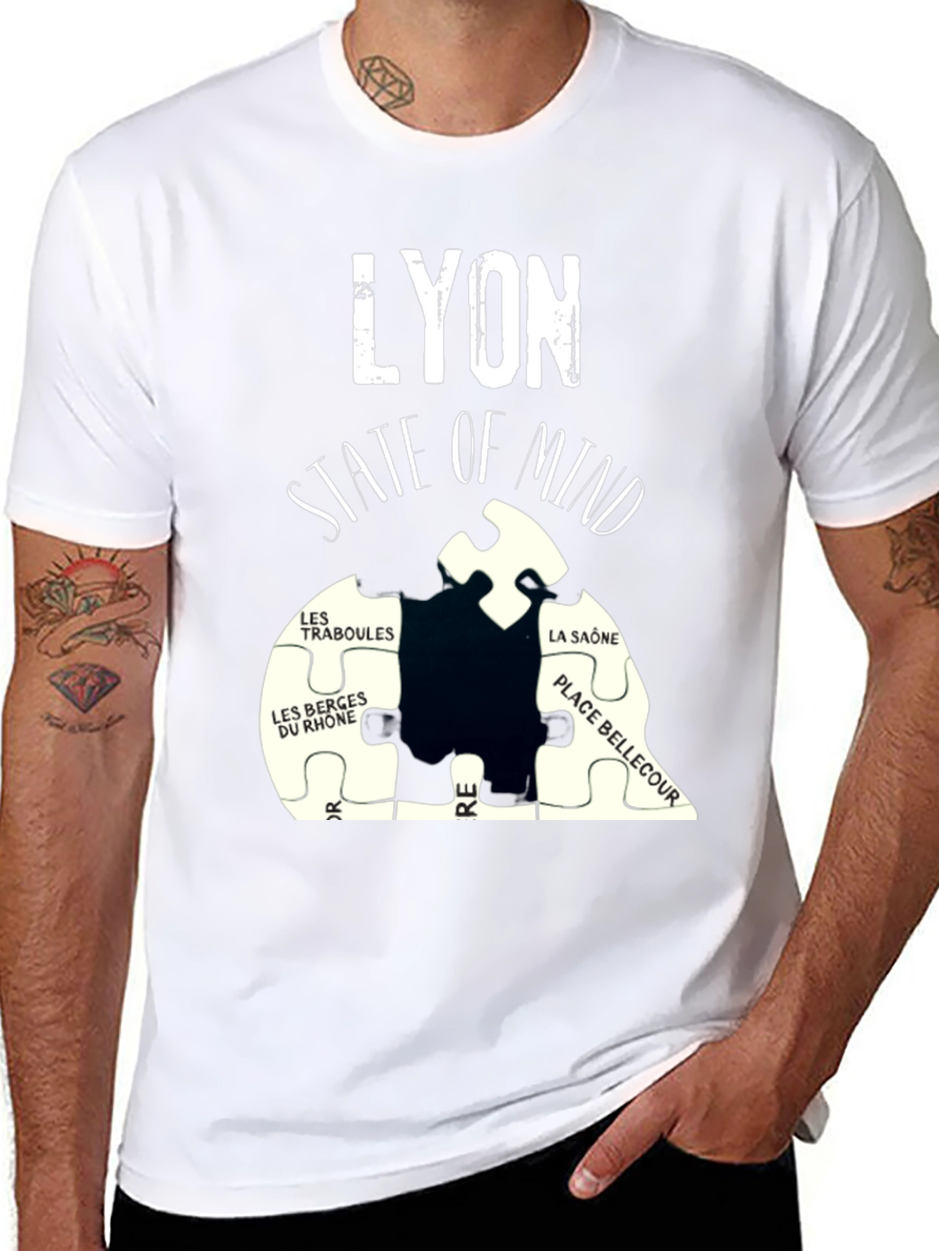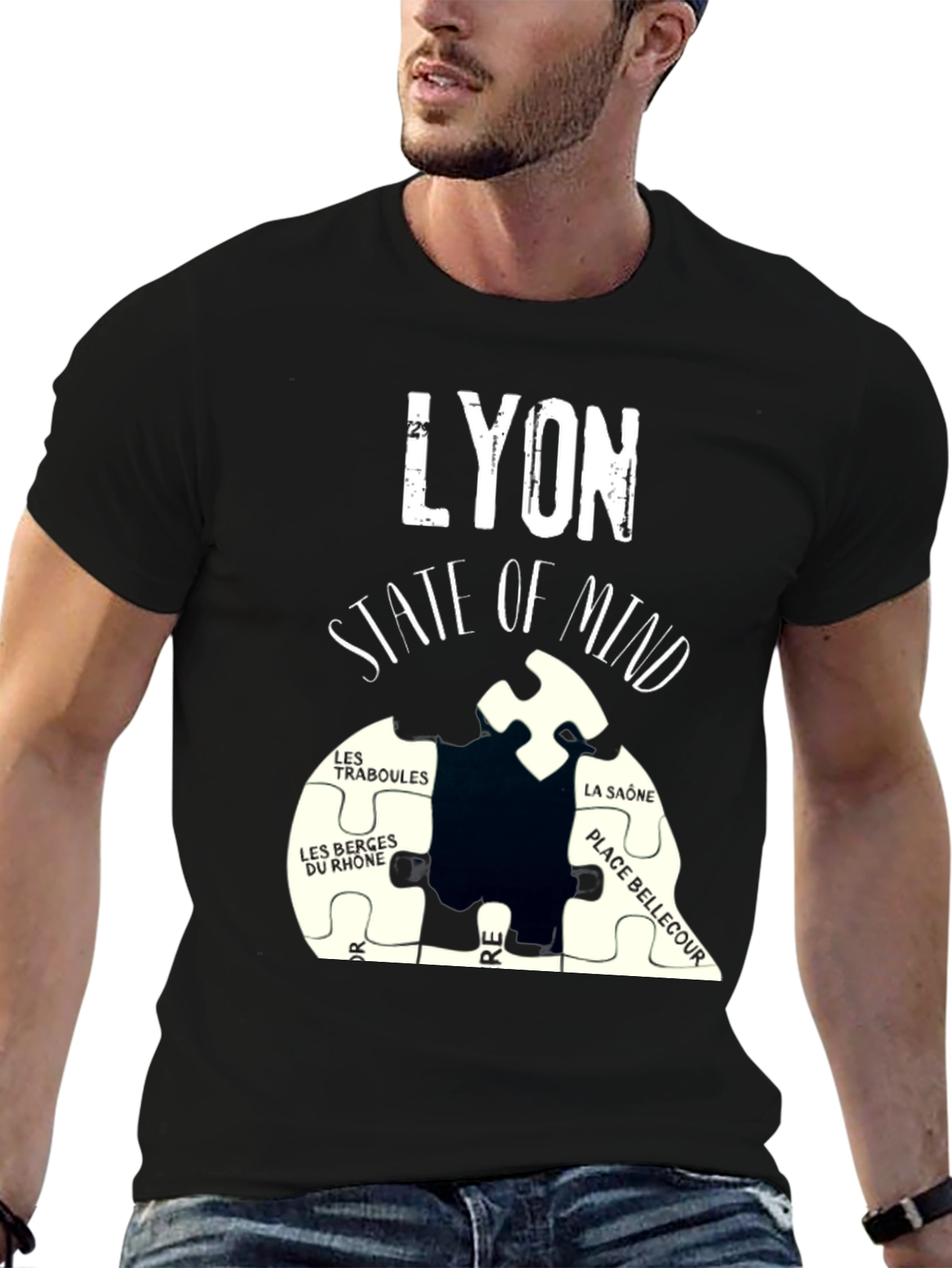 Show your love for Lyon with this unique t-shirt. This black tee features the word "LYON" in a distressed white font above a puzzle-piece design. The puzzle highlights Lyon's "State of Mind" and features names of notable places in the city, including LES TRABOULES, LES BERGES DU RHONE, LA SAÔNE, and PLACE BELLECOUR. It's made from a comfortable-looking fabric, perfect for casual wear. This shirt is a great way to show off your connection to Lyon or makes a great gift for anyone who loves the city. Get yours today and wear your Lyon pride!