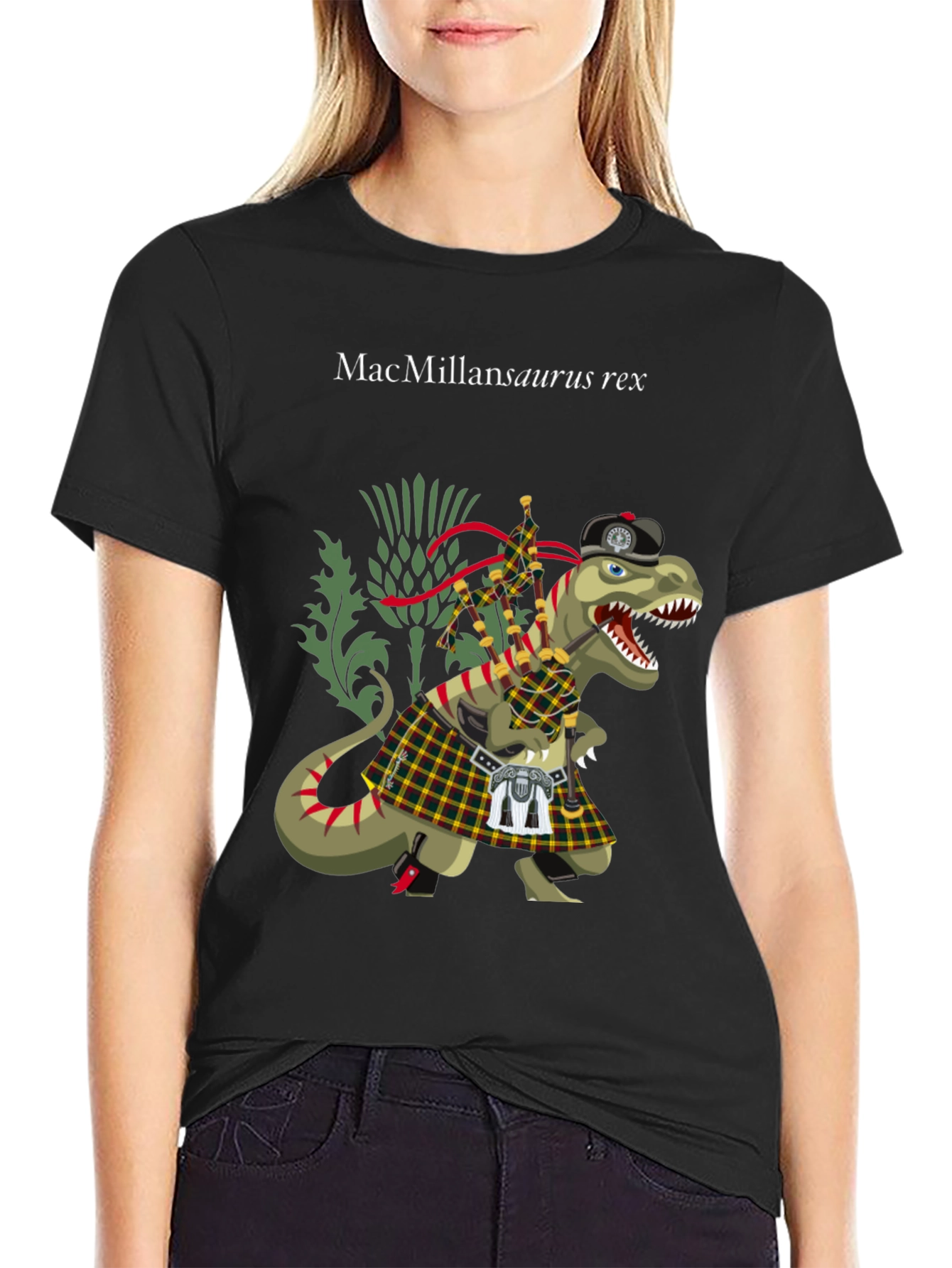 Show off your Scottish pride with this unique MacMillansaurus Rex T-shirt. This black T-shirt features a whimsical graphic of a dinosaur dressed in traditional Scottish attire, complete with a kilt and bagpipes, complemented by a thistle design. The fun design is sure to grab attention and spark conversations. This tee offers a comfortable fit perfect for casual wear. Celebrate your heritage with this eye-catching design!