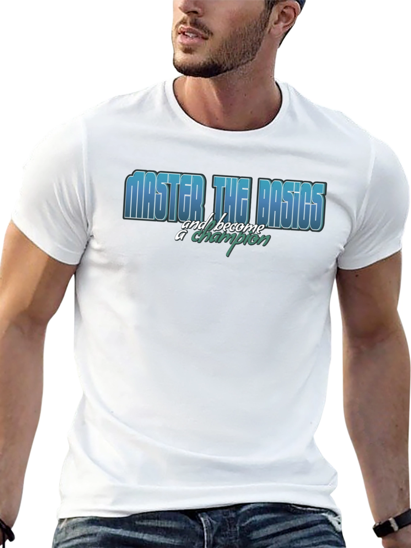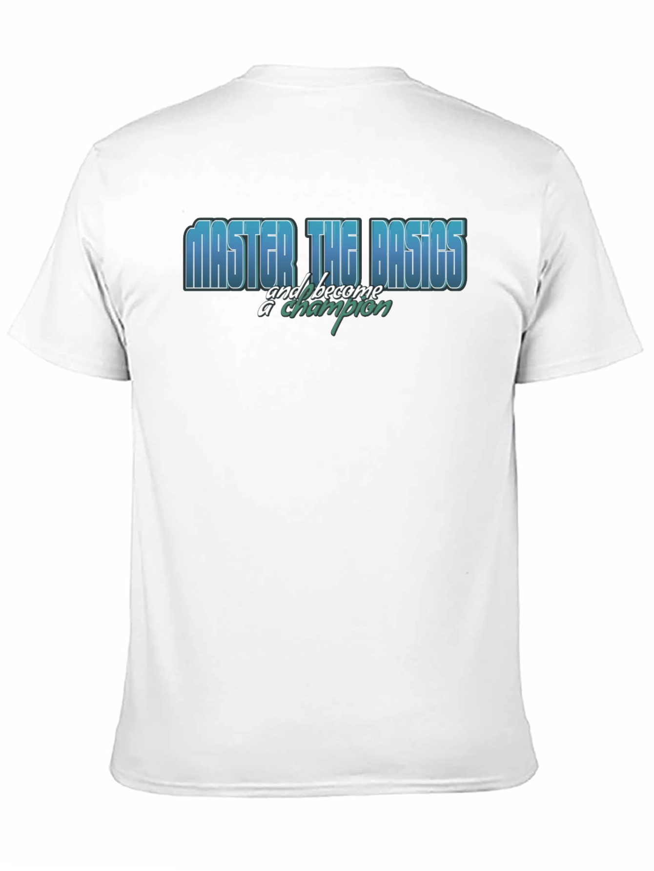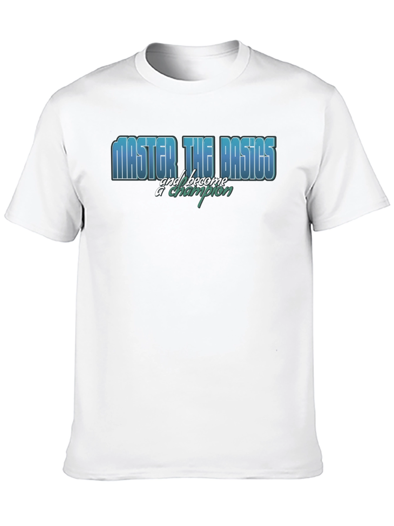 This stylish black t-shirt features a motivational graphic print. The phrase "MASTER THE BASICS and become a champion" is prominently displayed across the chest in a layered font. The word "MASTER THE BASICS" appears in blue, while the phrase "and become a champion" is written in a turquoise hue. The shirt is made from a soft-looking fabric. This tee is ideal for everyday wear, gym workouts, or casual outings. The classic fit and design will make it a wardrobe staple.