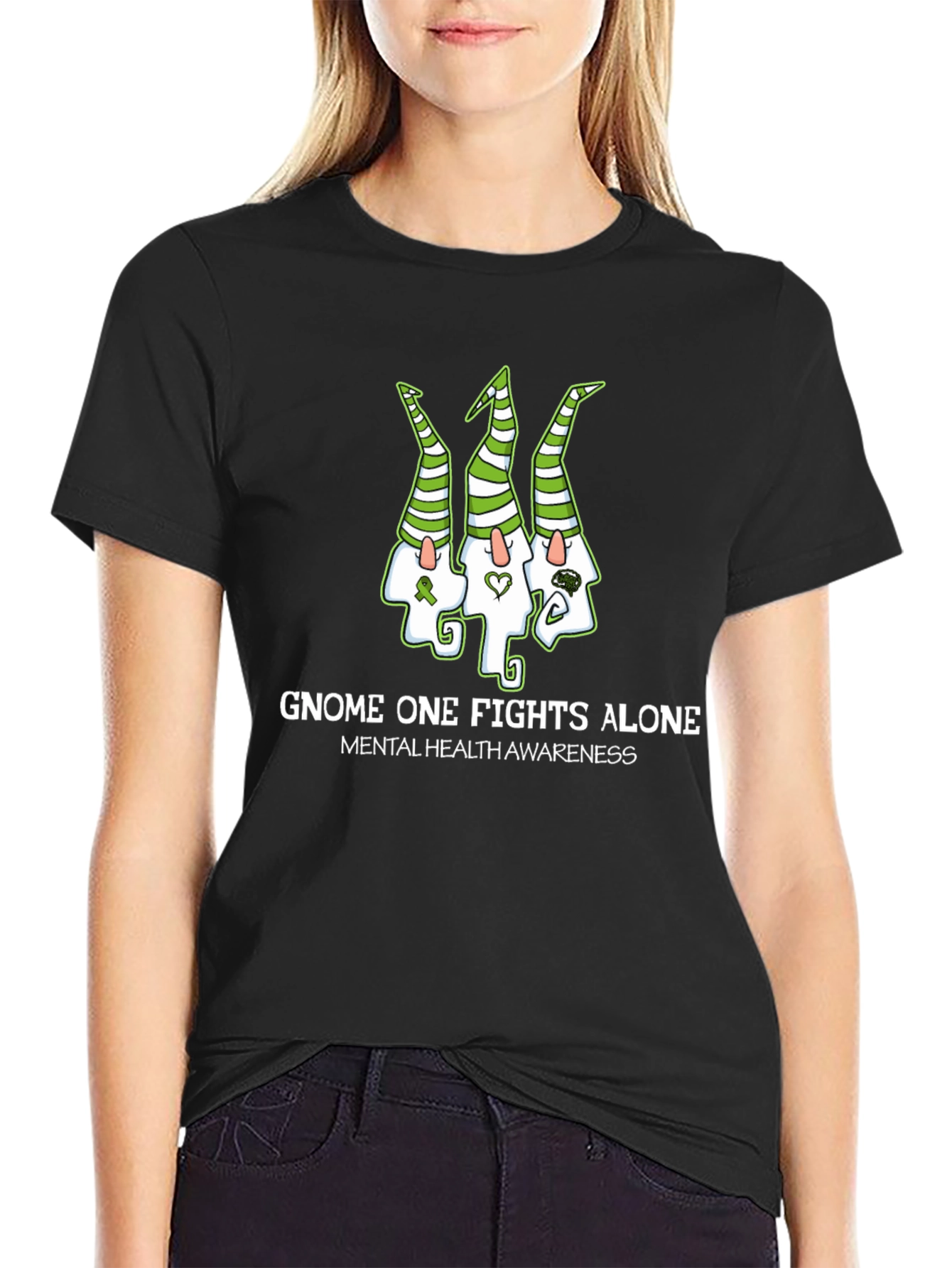 Show your support for mental health awareness with this unique t-shirt. The black tee features three adorable gnomes, each symbolizing a different aspect of mental well-being. The gnomes wear green and white striped hats. The shirt also features the powerful message, "GNOME ONE FIGHTS ALONE" along with "MENTAL HEALTH AWARENESS". Made from a comfortable, breathable fabric, this t-shirt is perfect for everyday wear, awareness events, or simply spreading a positive message. A great conversation starter and a thoughtful gift for advocates and supporters.